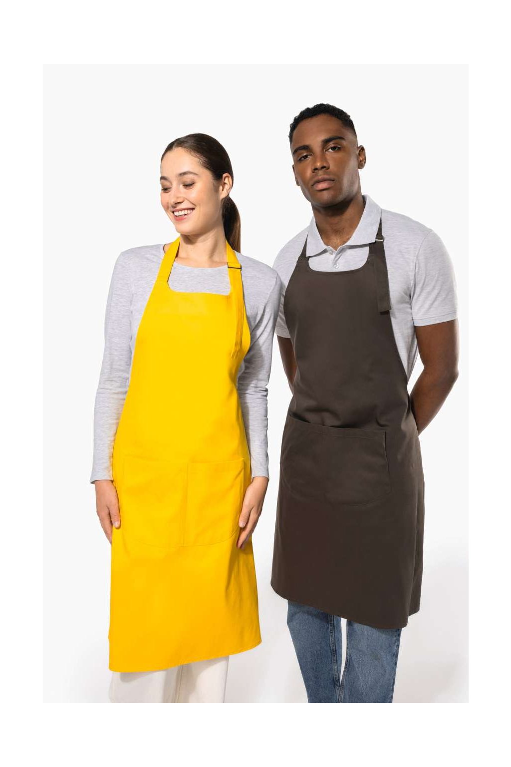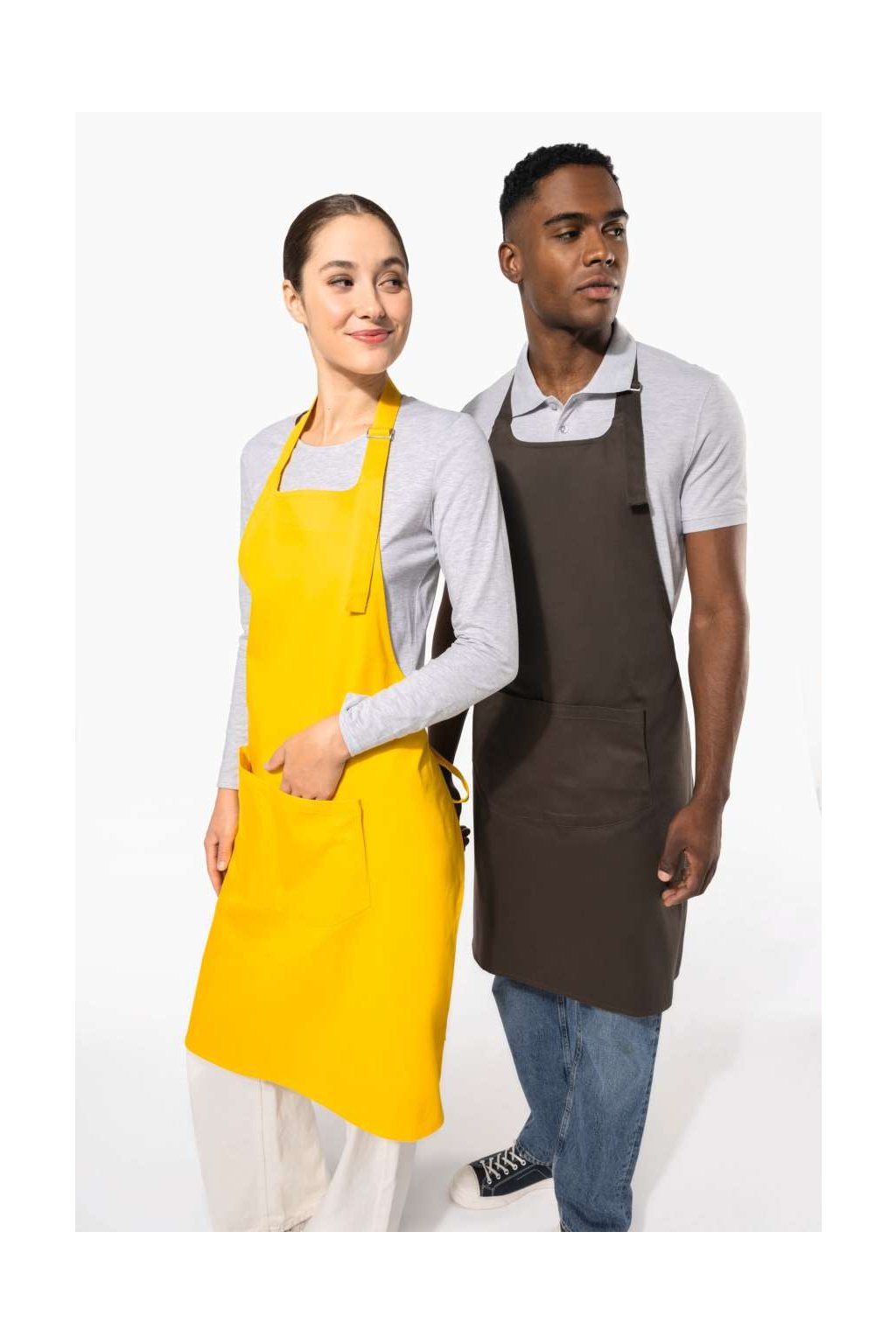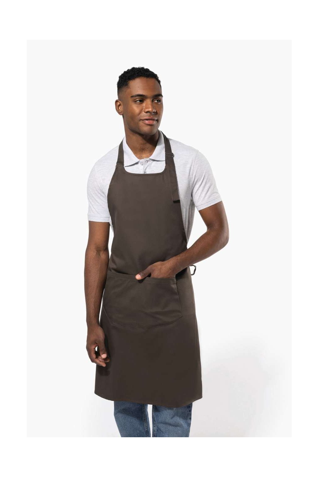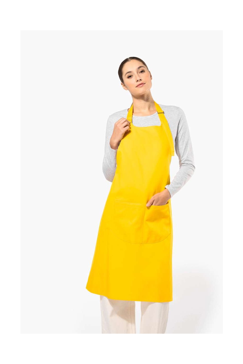 Bavlněná zástěra dostupná v mnoha barvách s prostornou kapsou s dvěma přihrádkami (20 cm délka x 31,5 cm šířka). Délku lze nastavit pomocí posuvné kovové spony. Denimové barvy: speciálně ošetřené s úmyslem vypadat opotřebovaně. Praní doma na 60 st. C