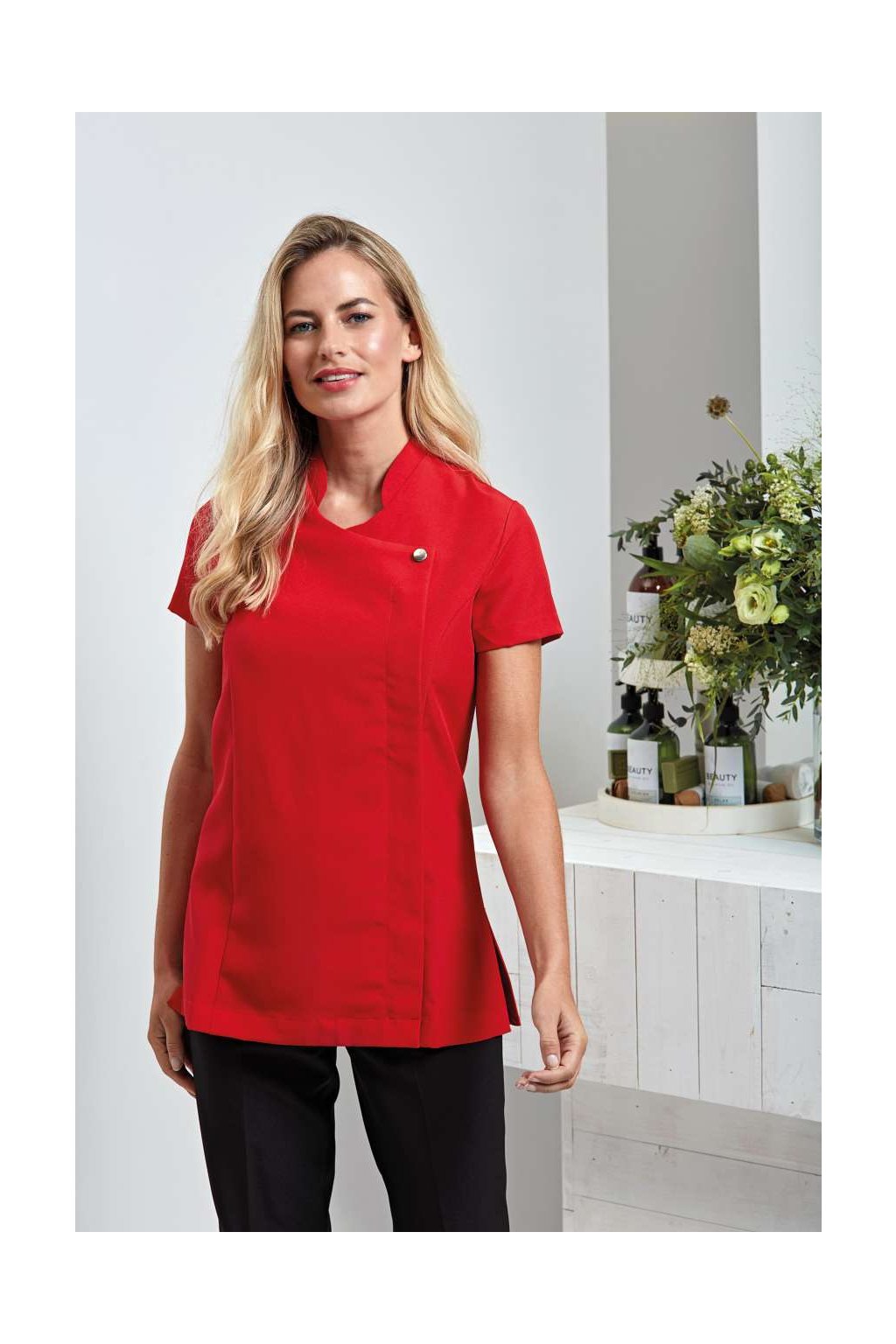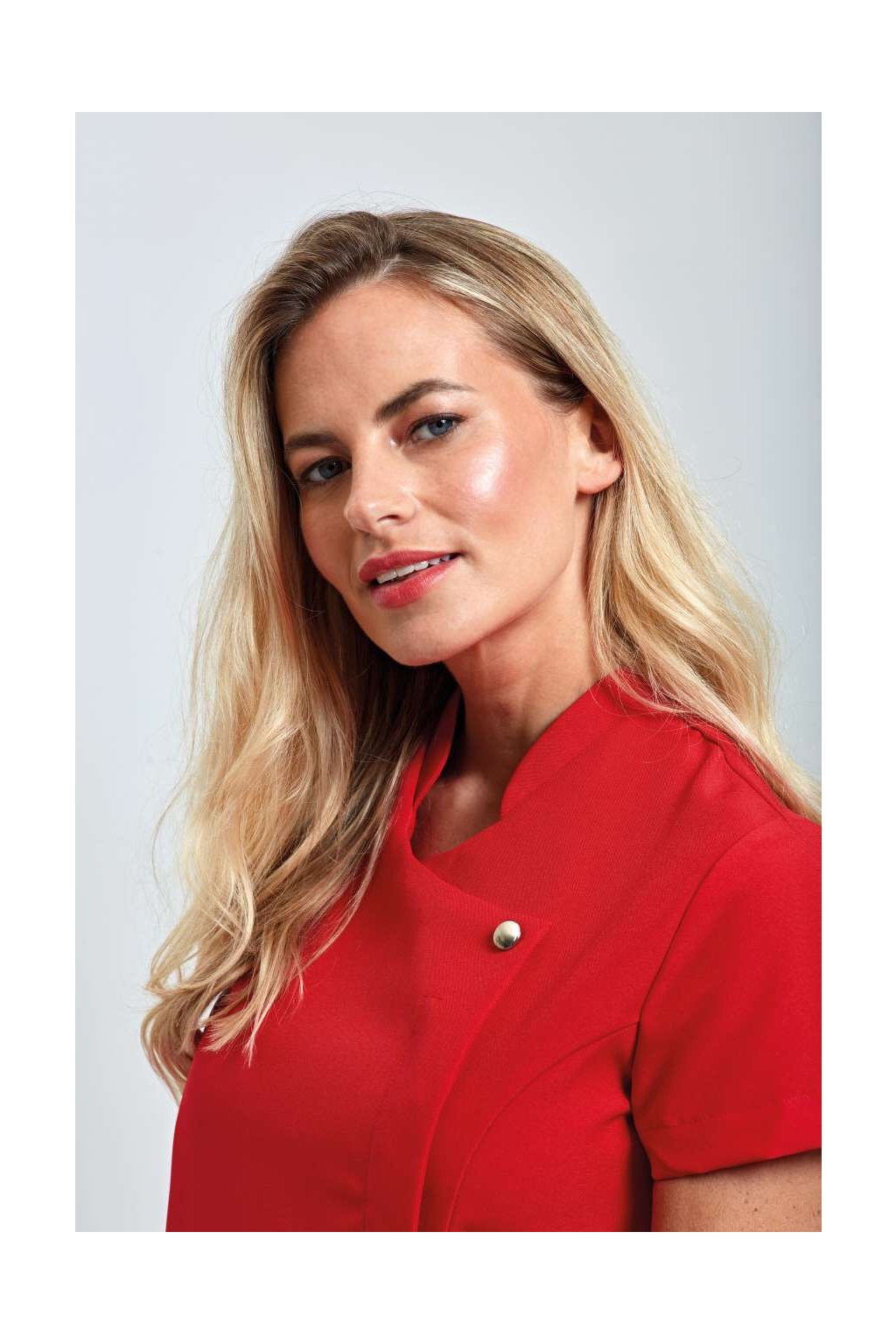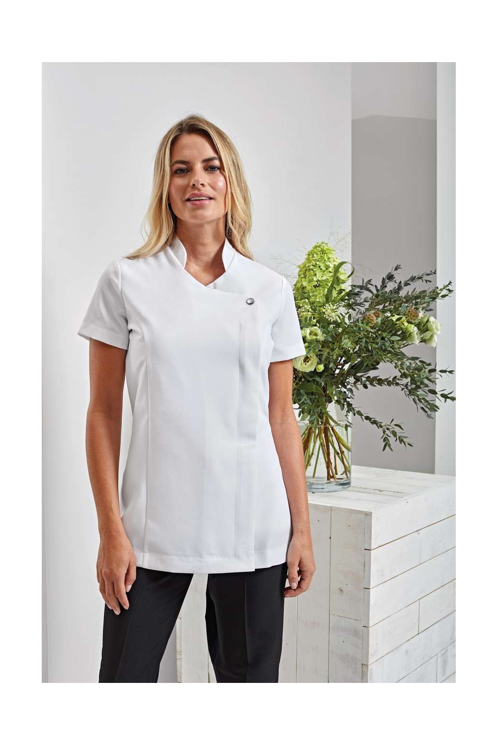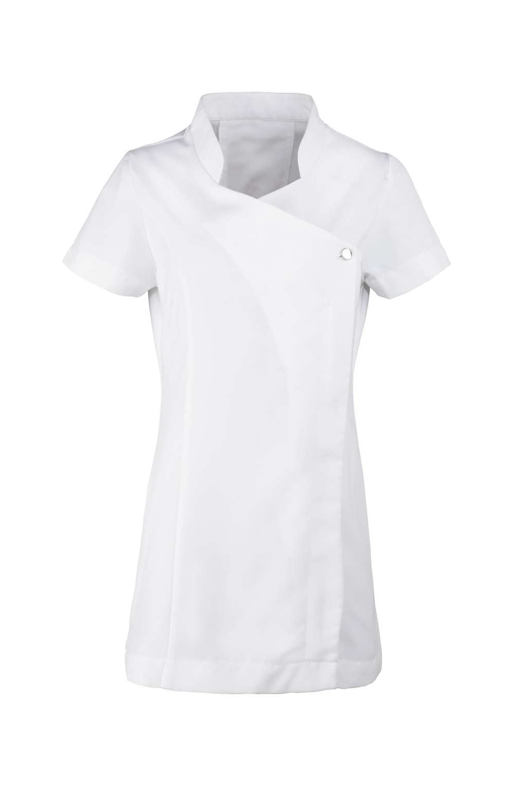 Lázešká tunika s krátkým rukávem princesového střihu, přední zapínání na knoflík, skrytý zipem, kulatým stojáčkem, bočními větracími otvory a zpětným záševkem.