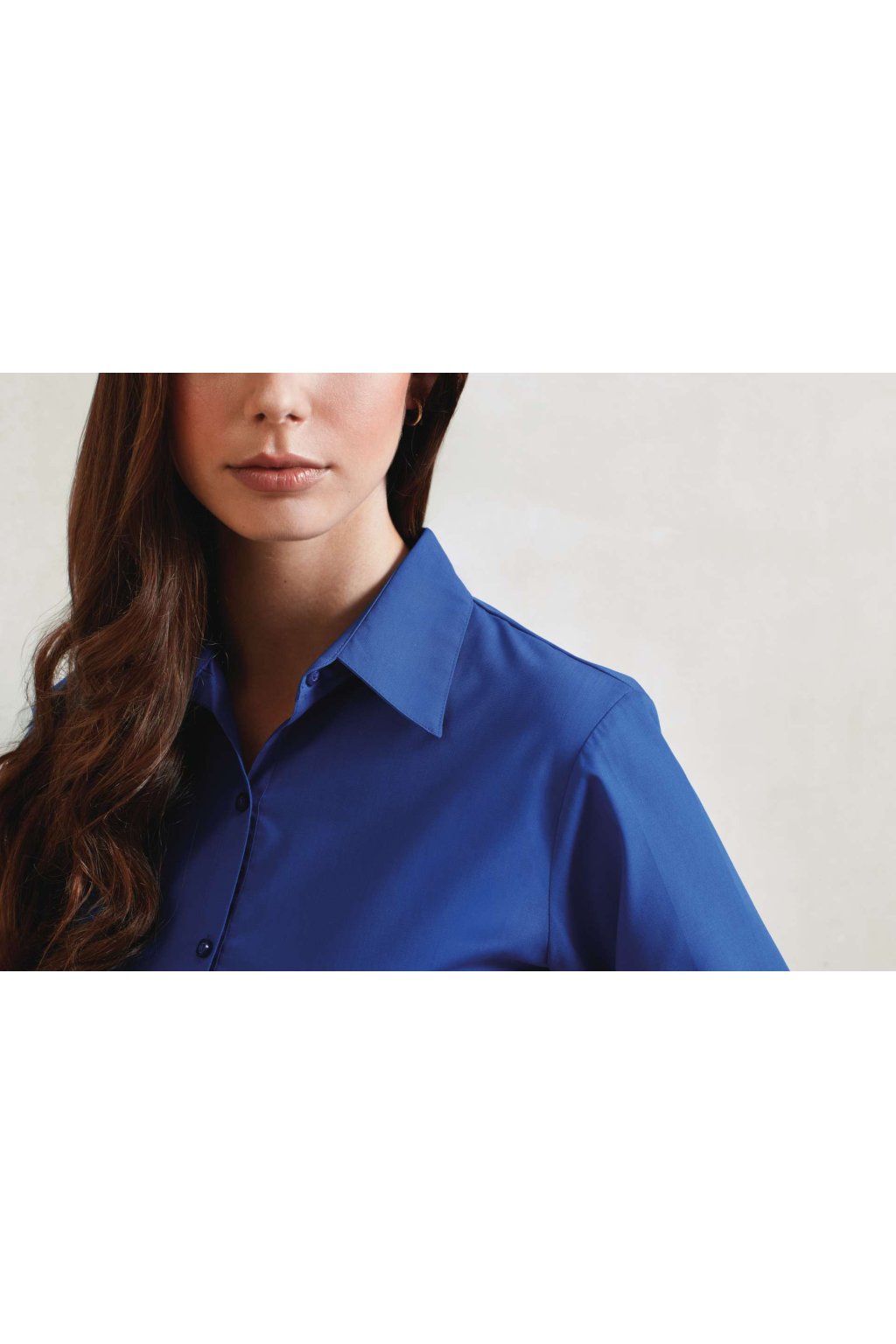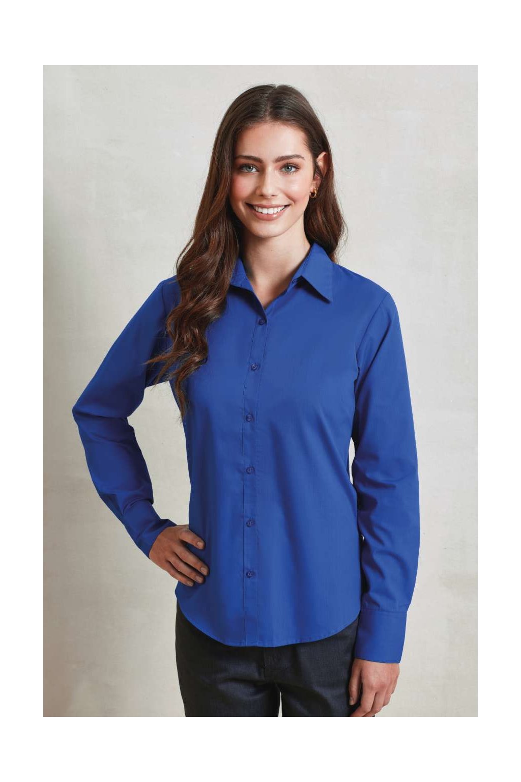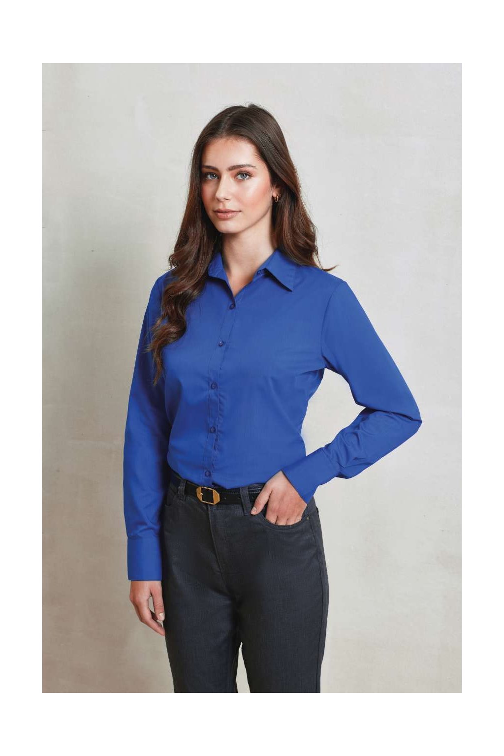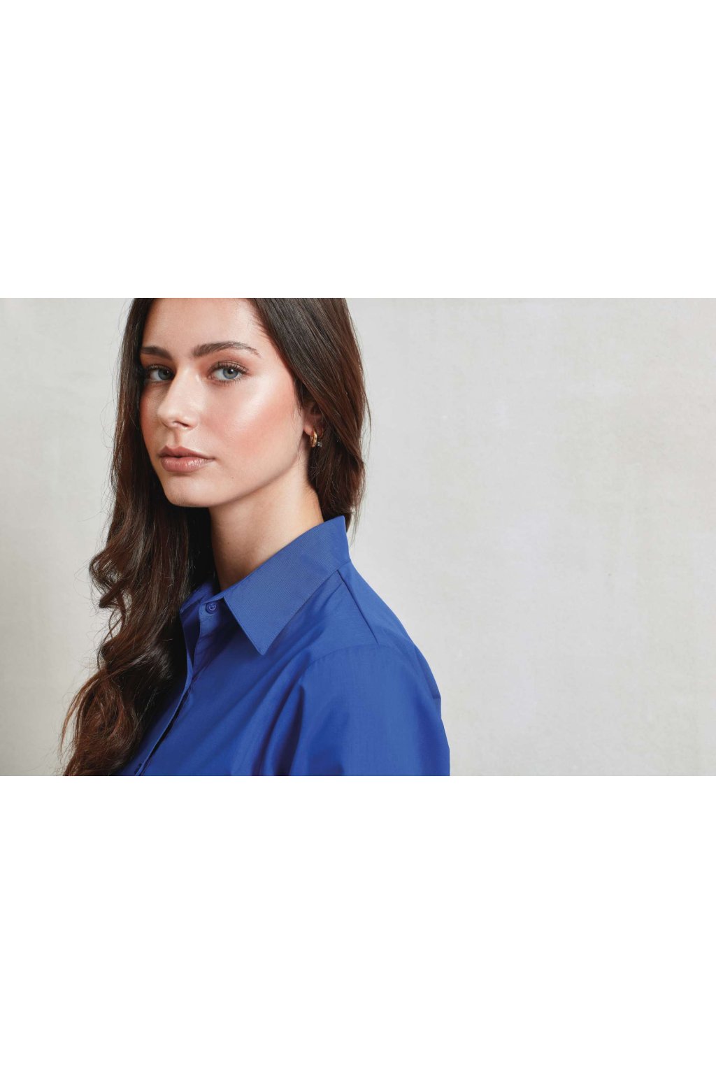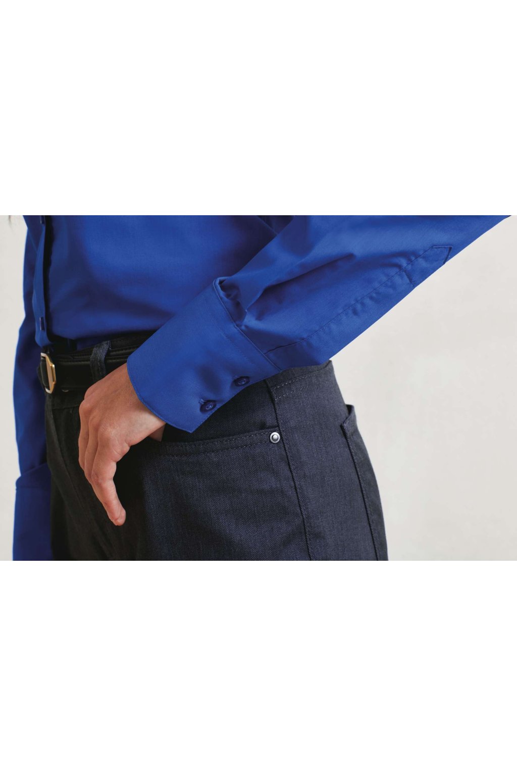 Slušivá pracovní košile s dlouhým rukávem je ušita střihem na míru, má měkké provedení u krku, přední a zadní záševky, zaoblený spodní lem, je snadno udržovatelná.