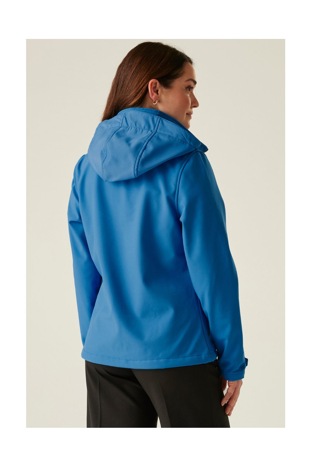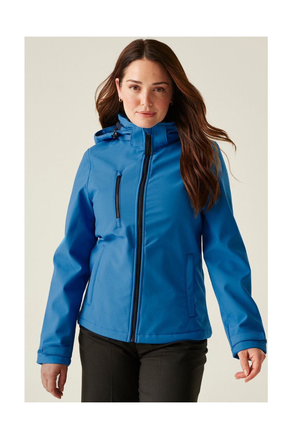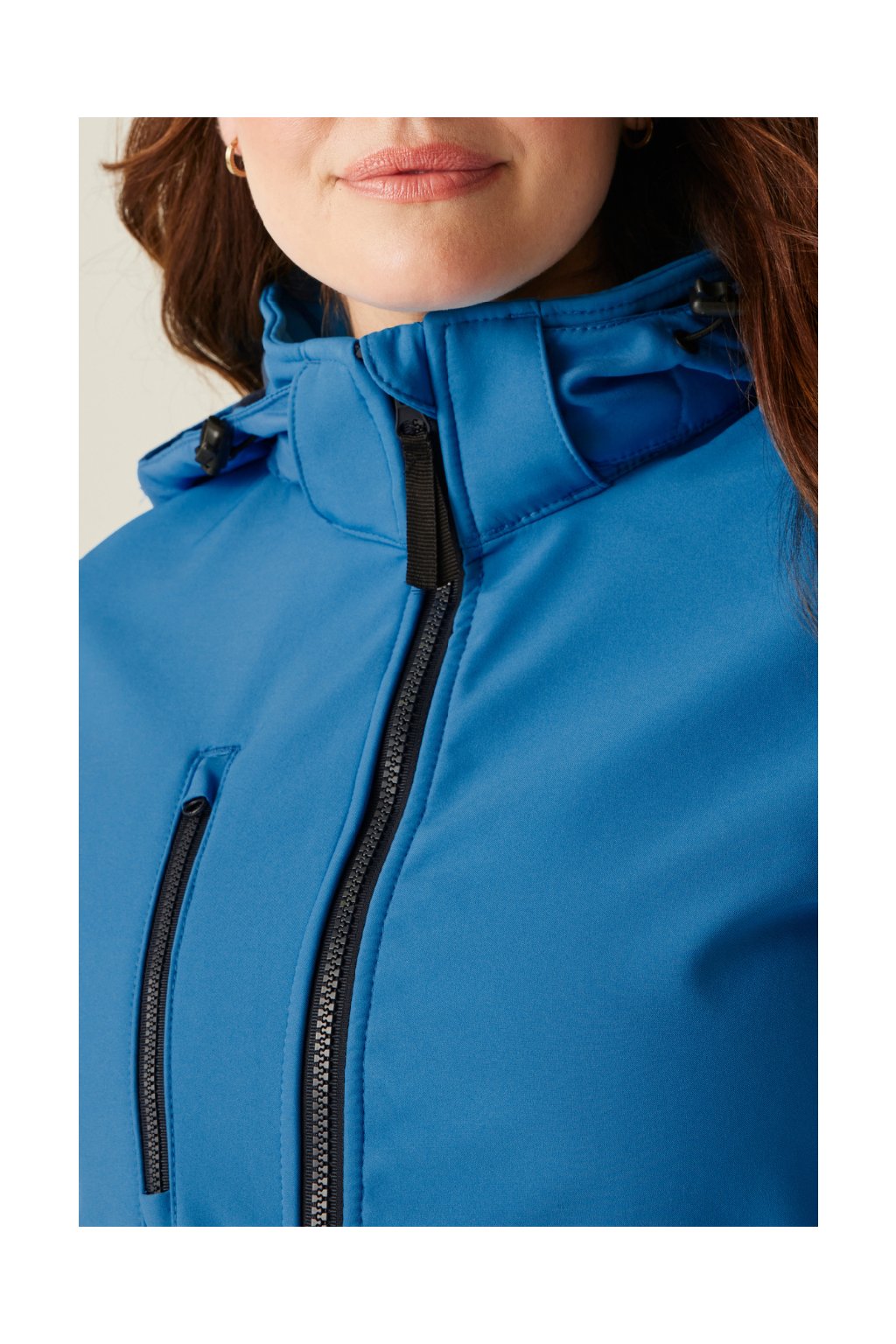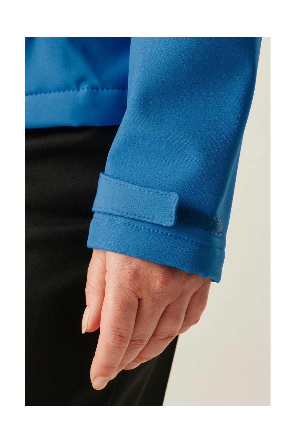 Velmi kvalitní softshellová dámská bunda je vyrobena z teplé nepromokavé a prodyšné třívrstvé membránové tkaniny. Je větruvzdorná a ideální do chladnějšího počasí. Dámská bunda má nastavitelnou kapuci, 2 spodní a jednu náprsní kapsu na zip a nastavitelné manžety.