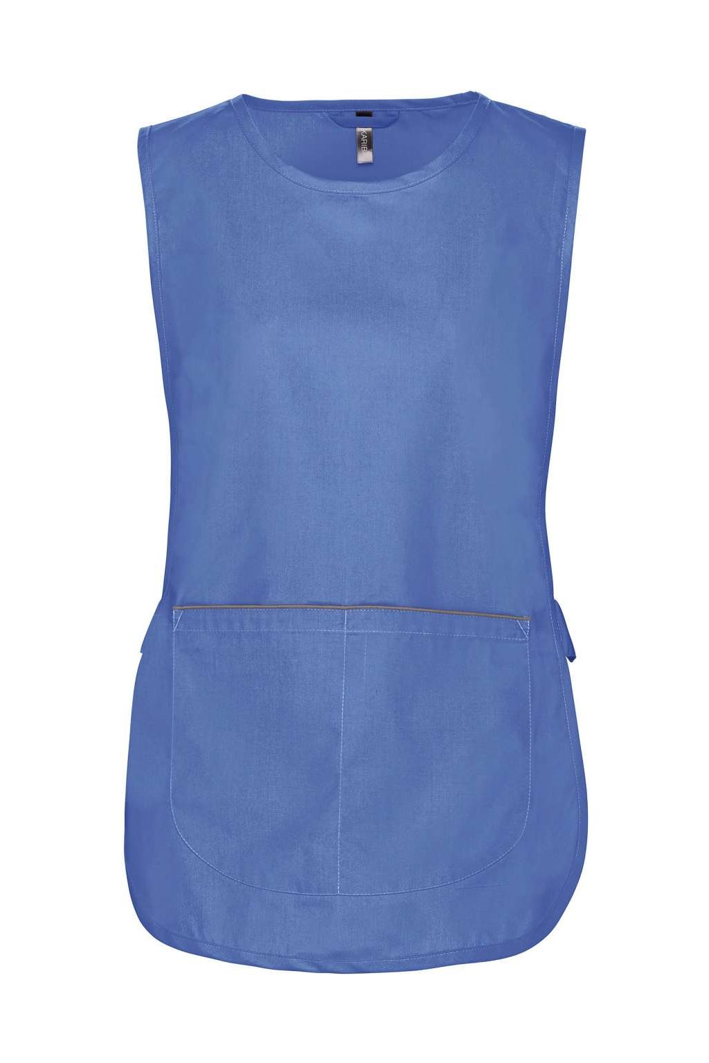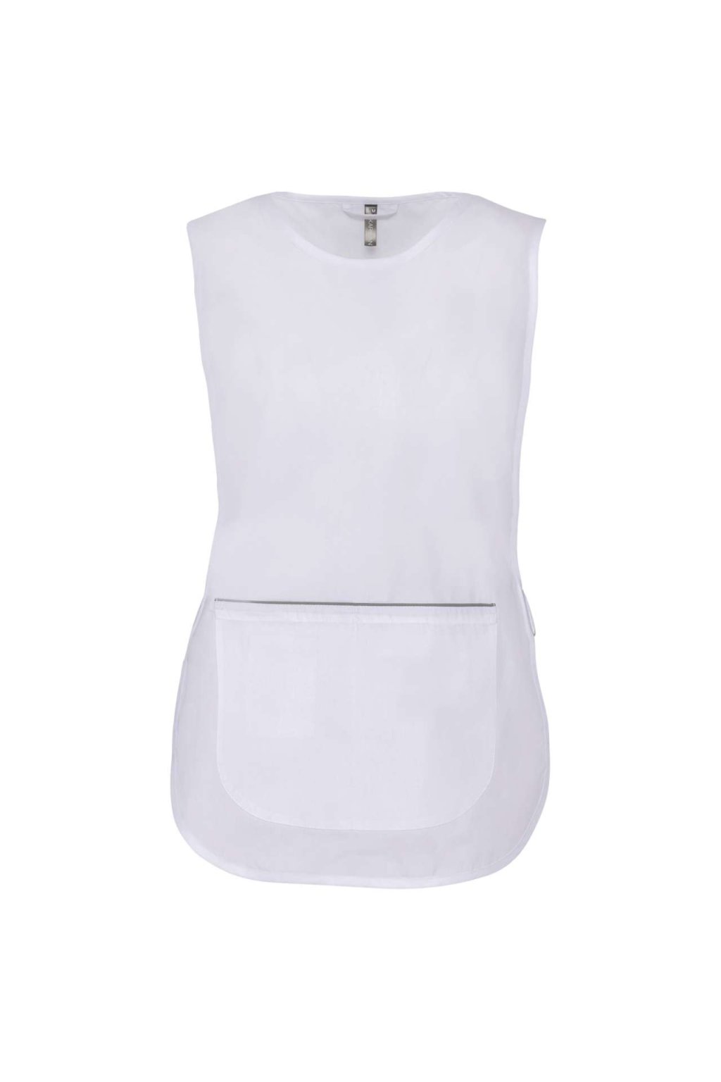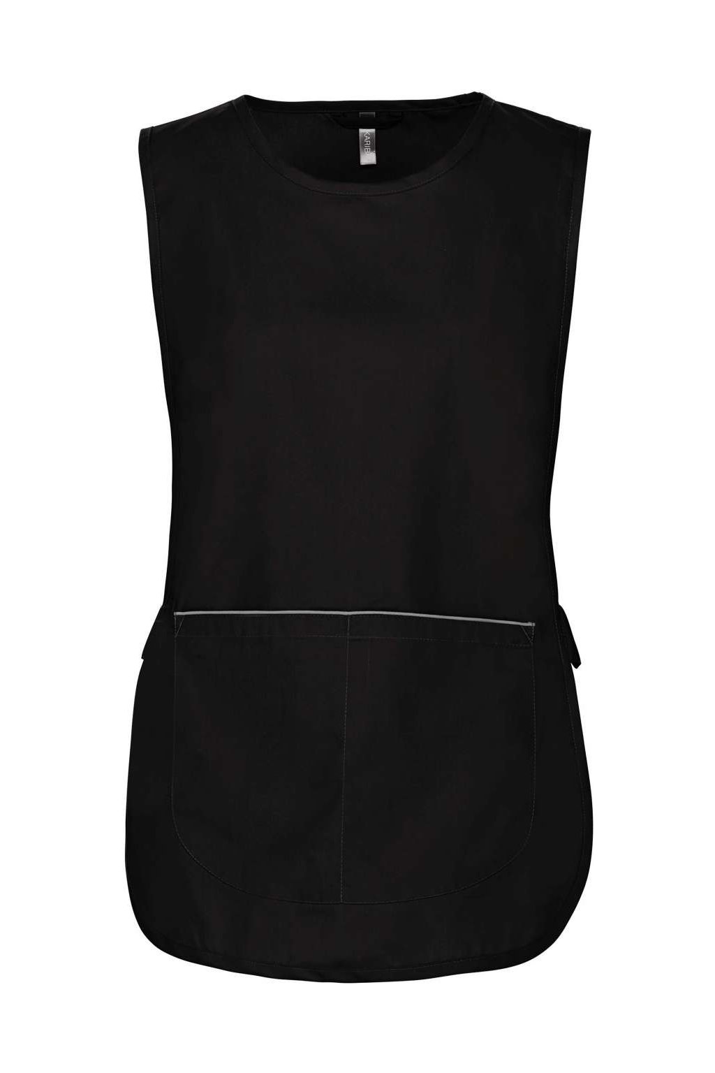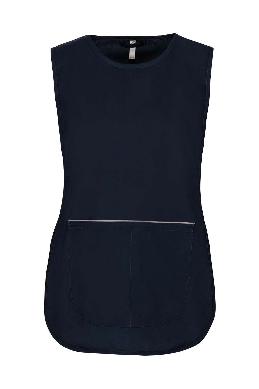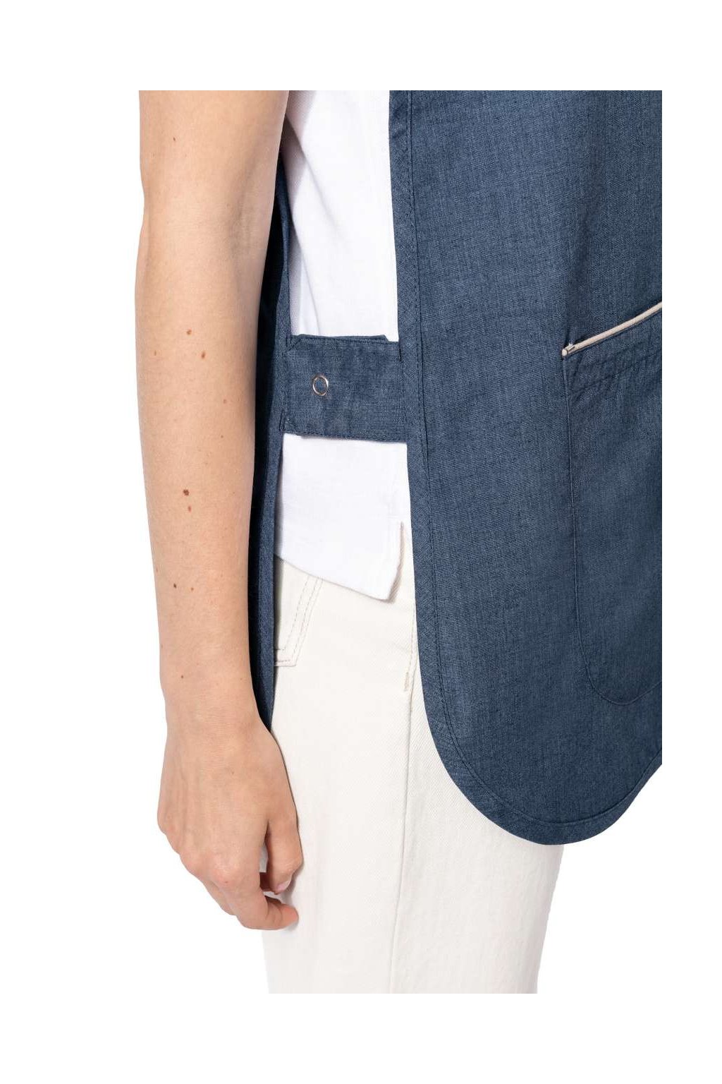 Dámská pracovní tunika / zástěra je z odolné tkaniny a má klasický střih. Zástěra má velkou přední kapsu s dvěma oddíly a jednu malou vnitřní kapsou. Vesta se dá upravit patenty na boku.