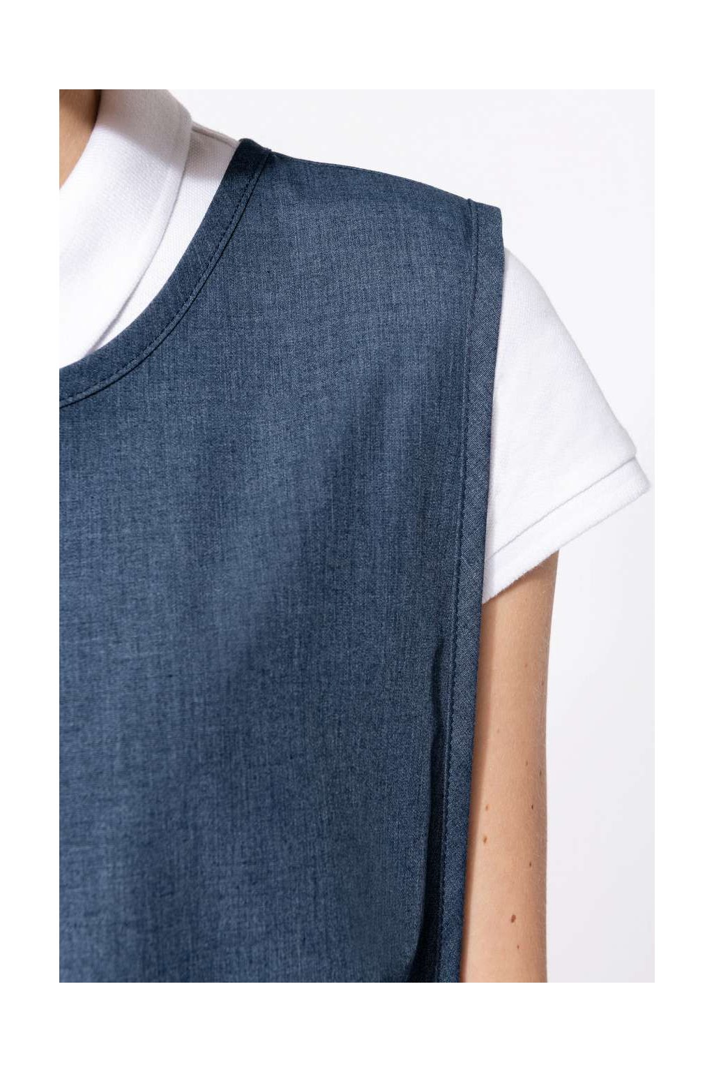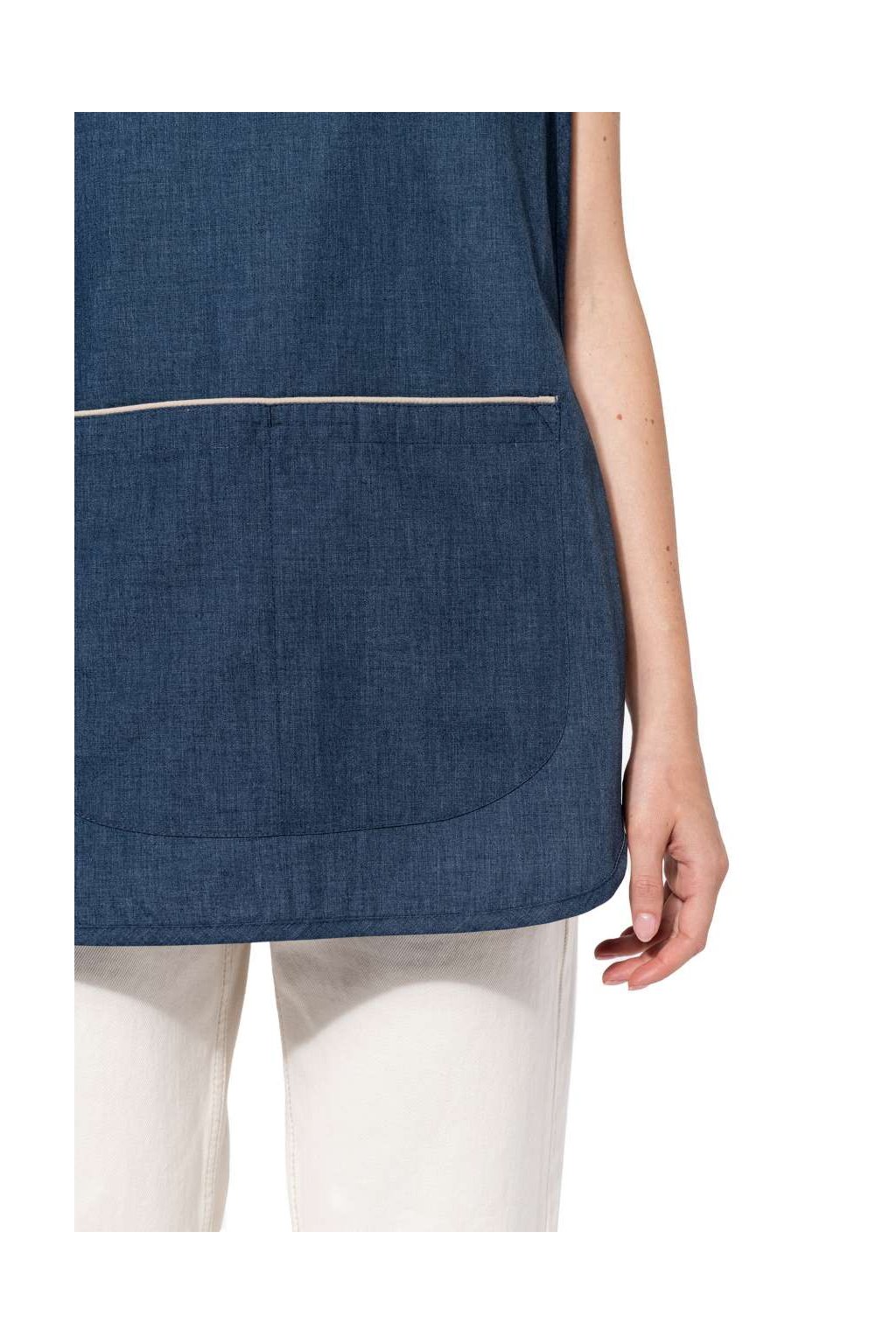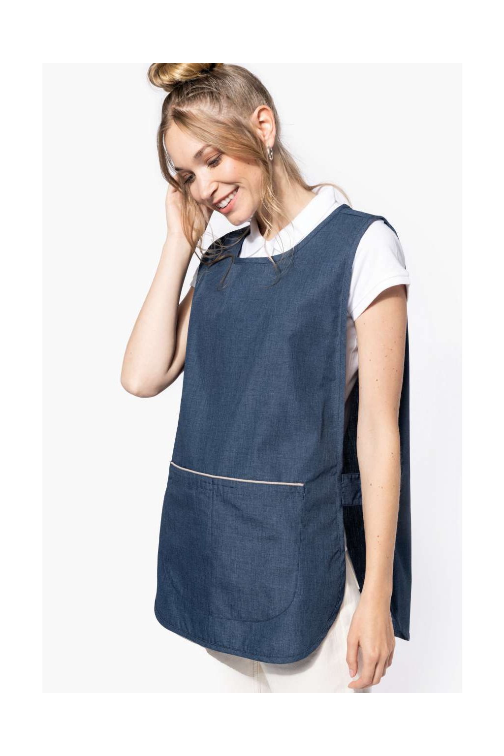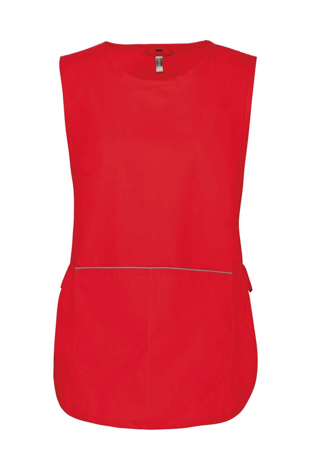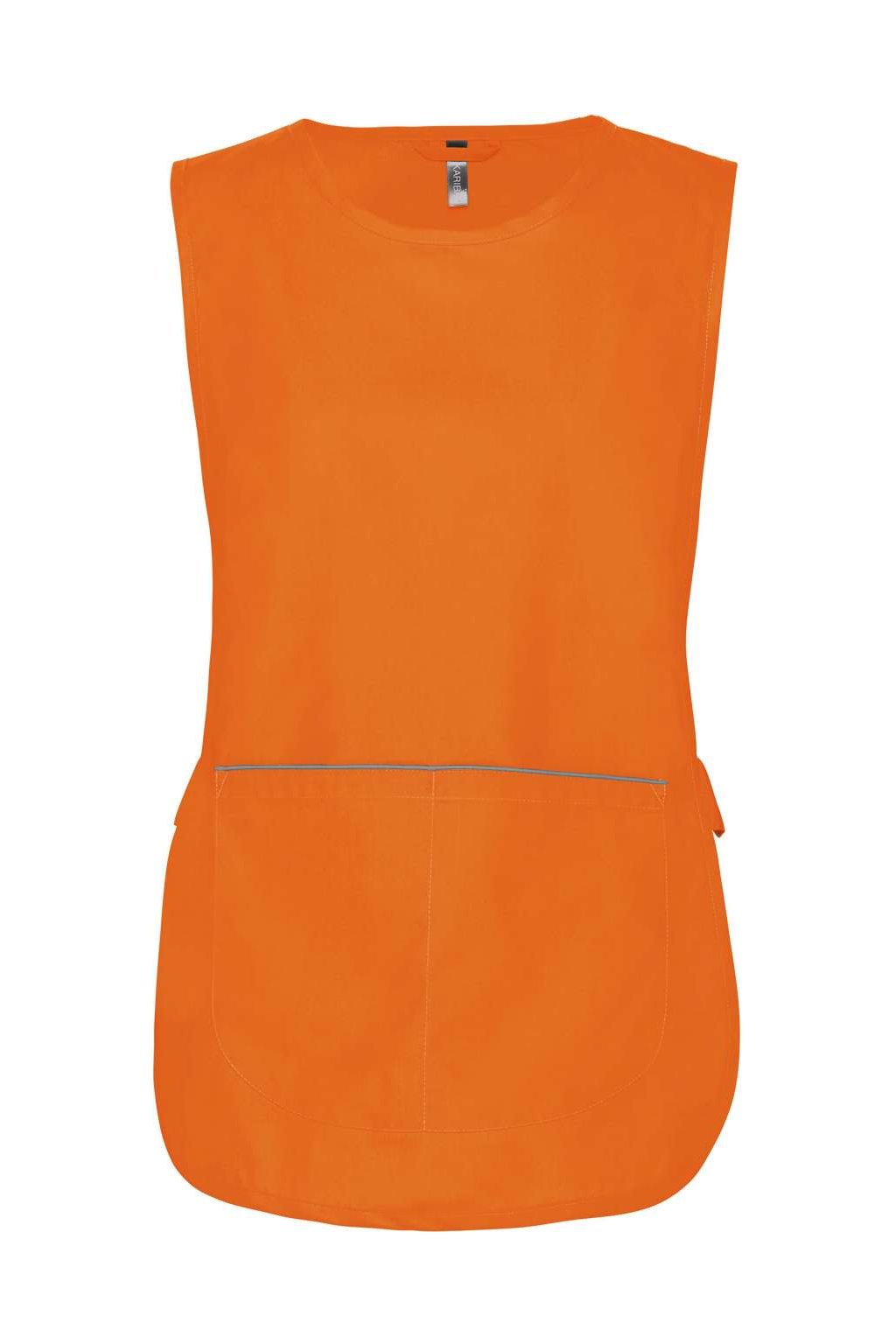 Dámská pracovní tunika / zástěra je z odolné tkaniny a má klasický střih. Zástěra má velkou přední kapsu s dvěma oddíly a jednu malou vnitřní kapsou. Vesta se dá upravit patenty na boku.