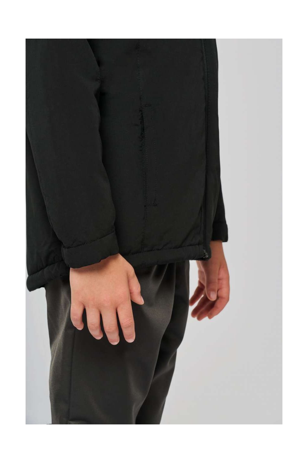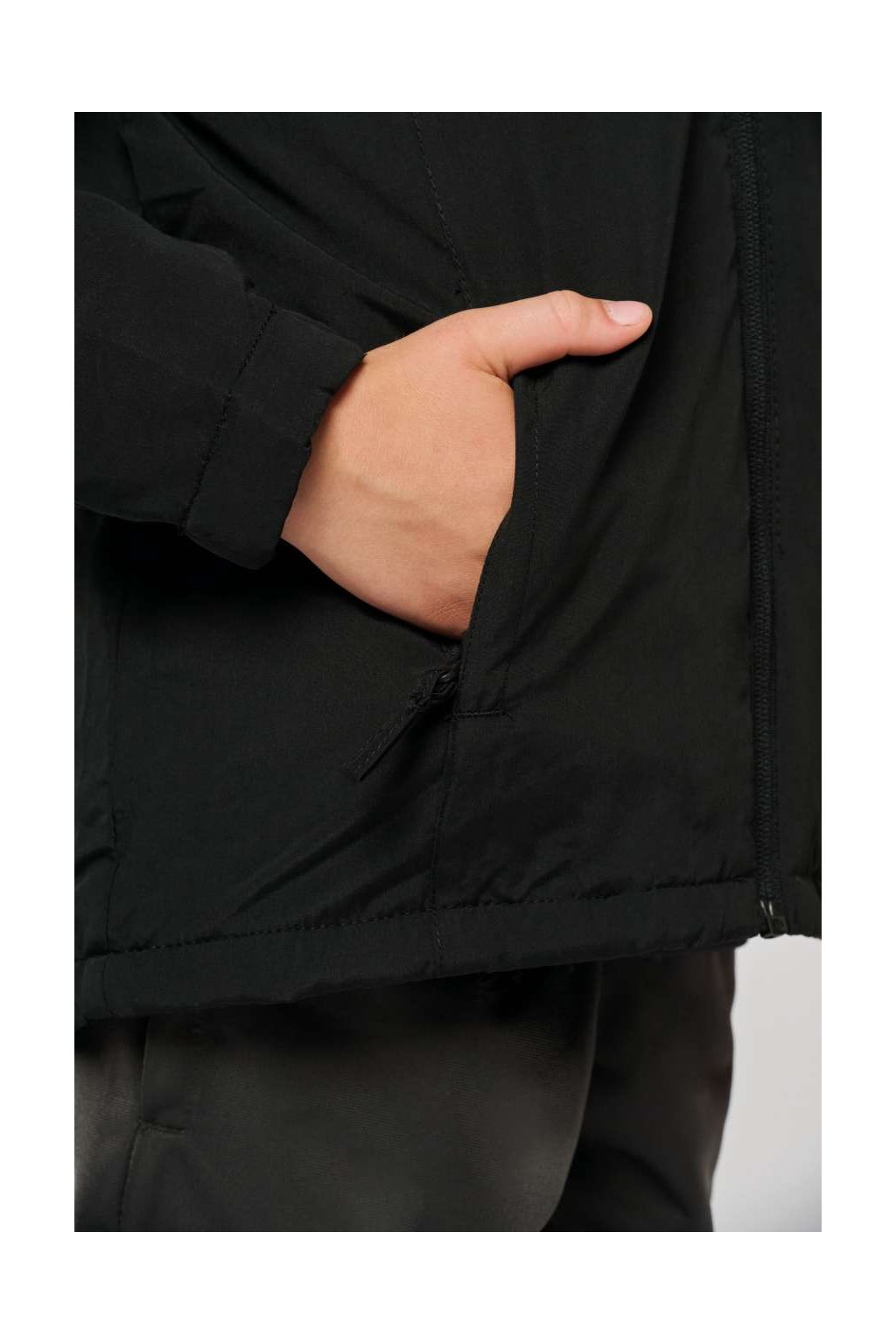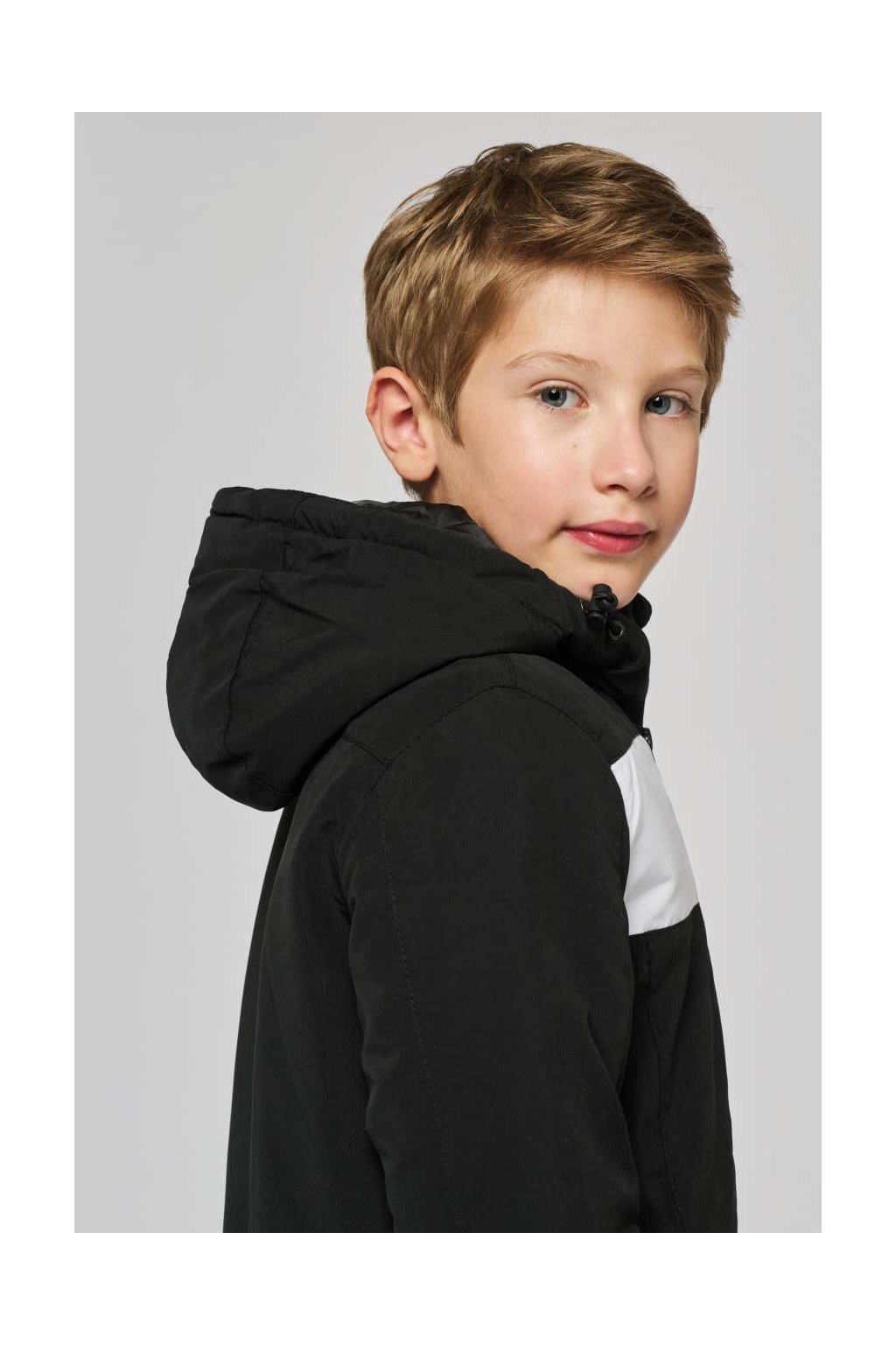 Tato nepromokavá bunda dětem perfektně poslouží nejen v nepříznivém počasí. Vnější materiál má vodoodpudivou úpravu a je velmi jemný na dotek. Bunda má podšívku a zapíná se na zip. Třídilná prošívaná kapuce má stahovací sňůrky se zarážkami. Bunda má dvě kapsy na zip a jednu vnitřní kapsu. Na hrudi je široký kontrastní pruh.