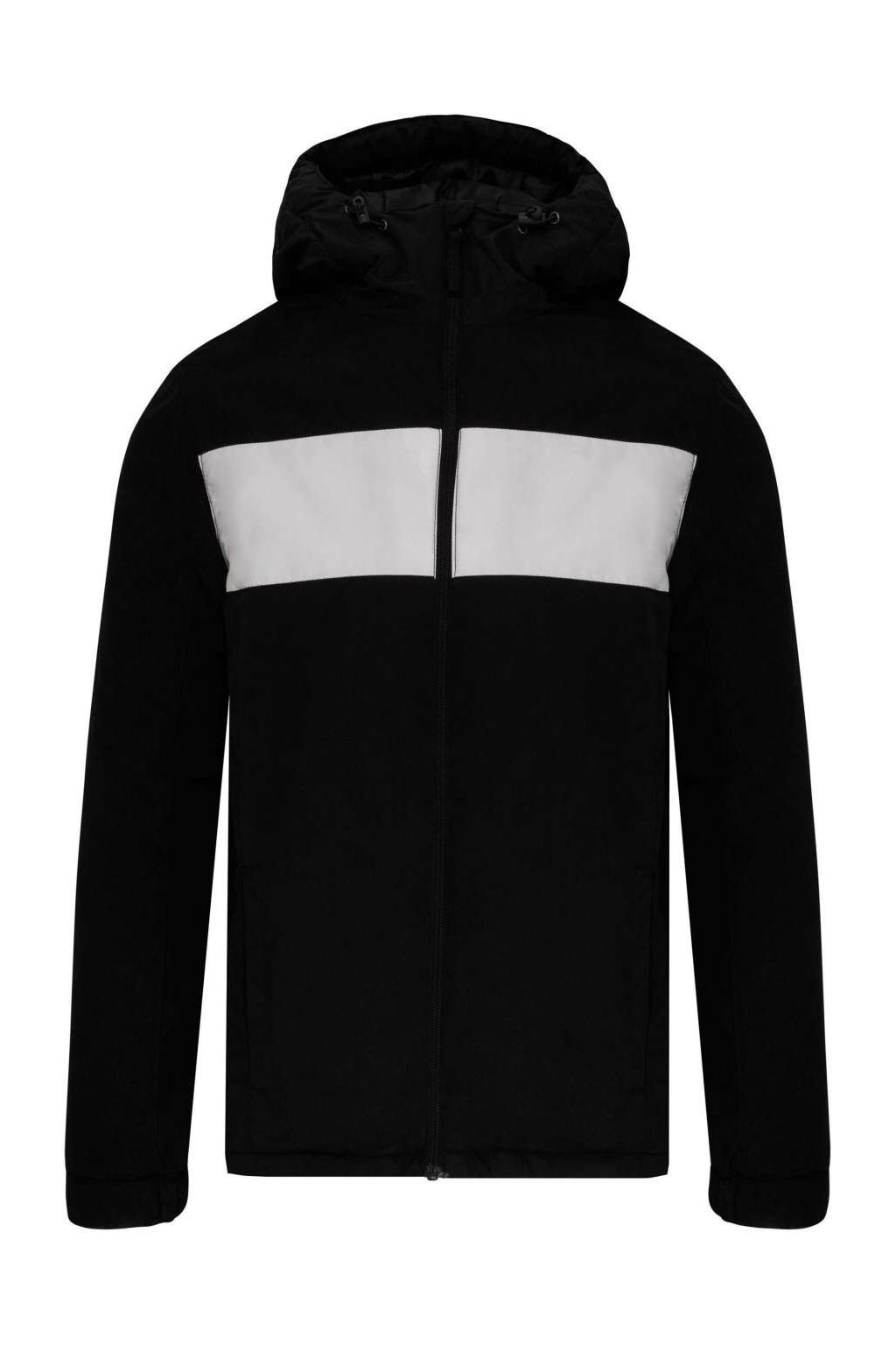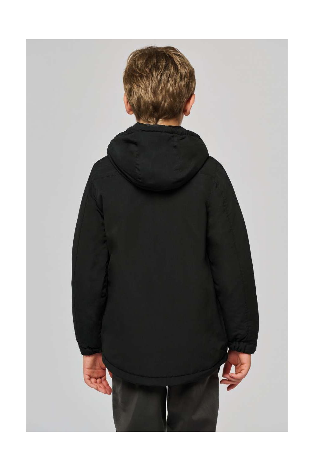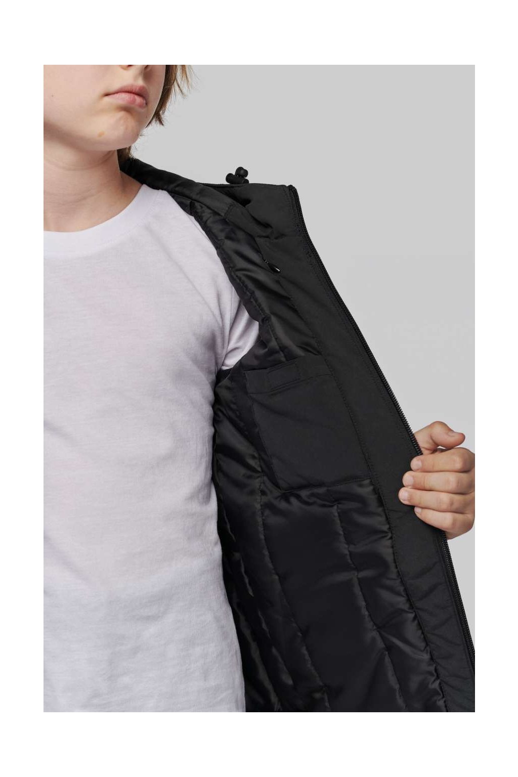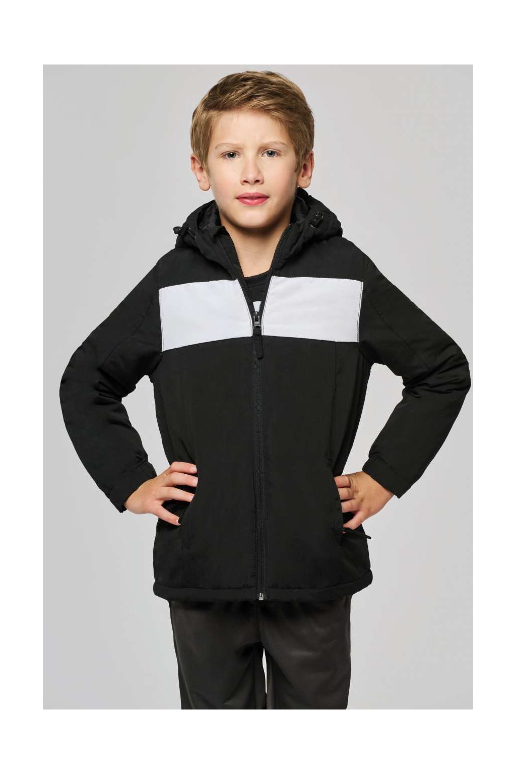 Tato nepromokavá bunda dětem perfektně poslouží nejen v nepříznivém počasí. Vnější materiál má vodoodpudivou úpravu a je velmi jemný na dotek. Bunda má podšívku a zapíná se na zip. Třídilná prošívaná kapuce má stahovací sňůrky se zarážkami. Bunda má dvě kapsy na zip a jednu vnitřní kapsu. Na hrudi je široký kontrastní pruh.