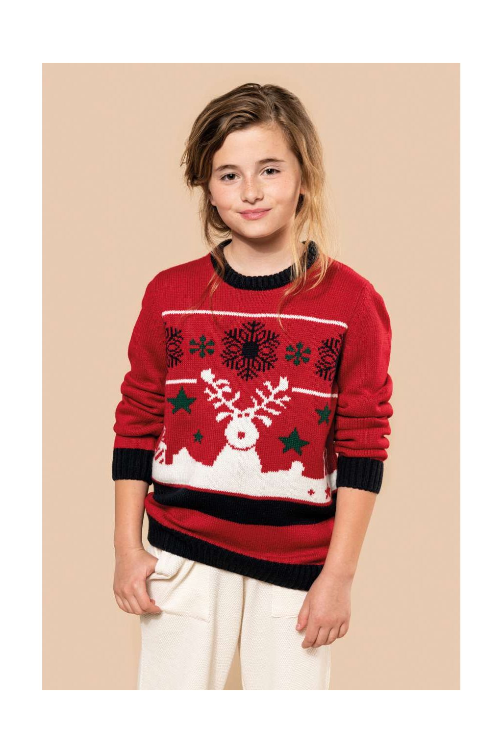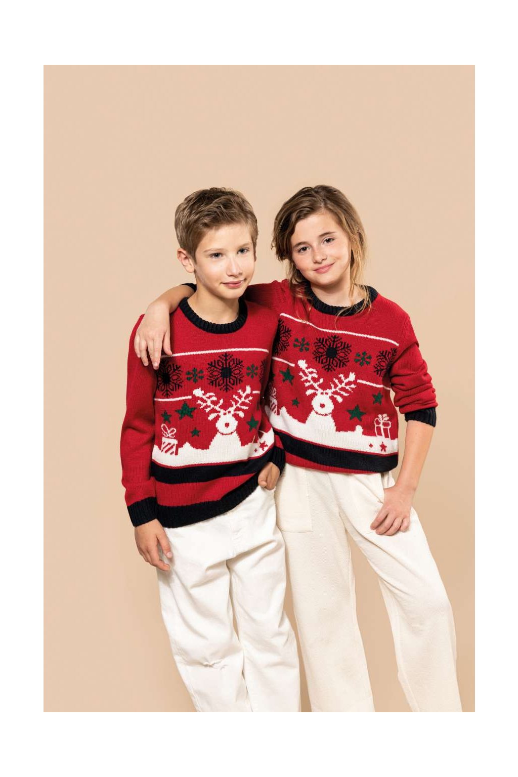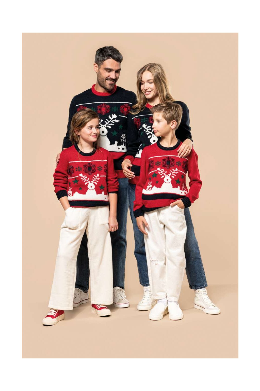 Vánoční dětský svetr potěší vaše děti veselým obrázkem soba a budou ho chtít nosit nejen o vánocích. Svetr je rovného střihu. Na přední straně je obrázek dárků, soba a vloček. Výstřih, manžety a spodní lem jsou žebrované a mají kontrastní barvu a jsou s obsahem elastanu, aby se zabránilo ztrátě jejich tvaru.