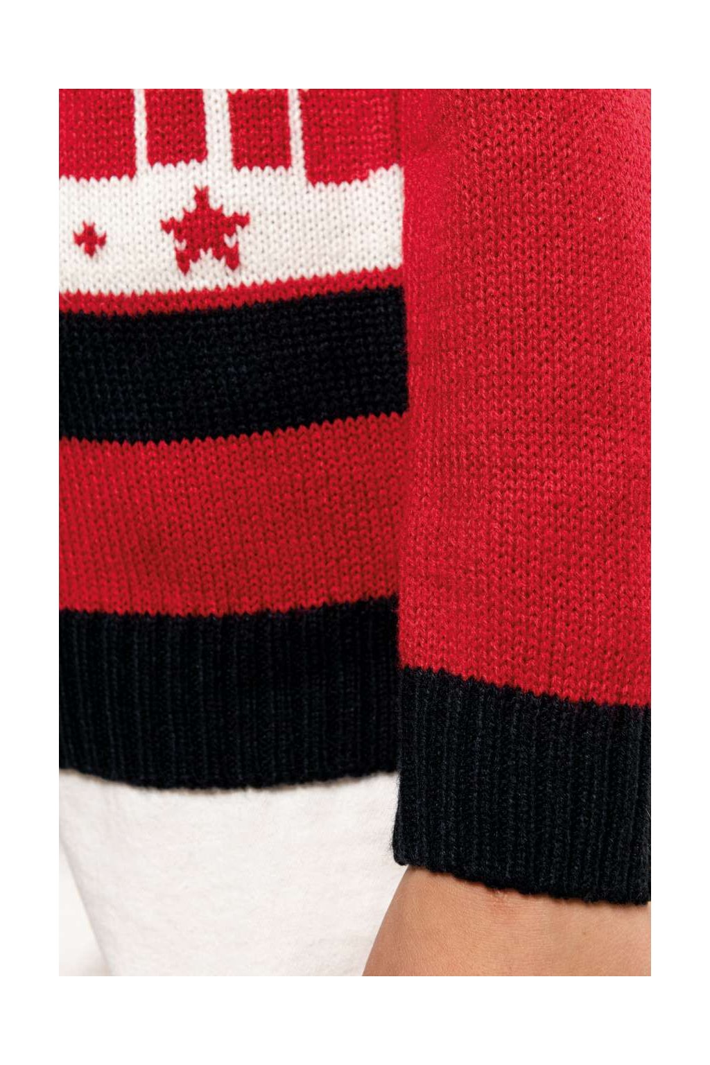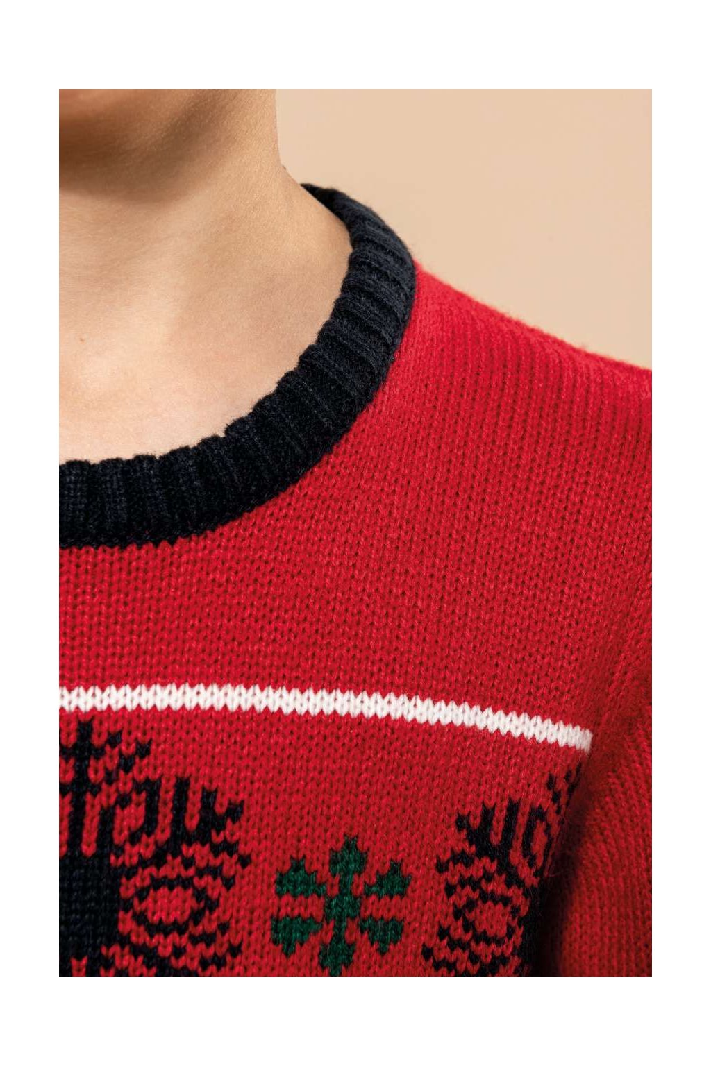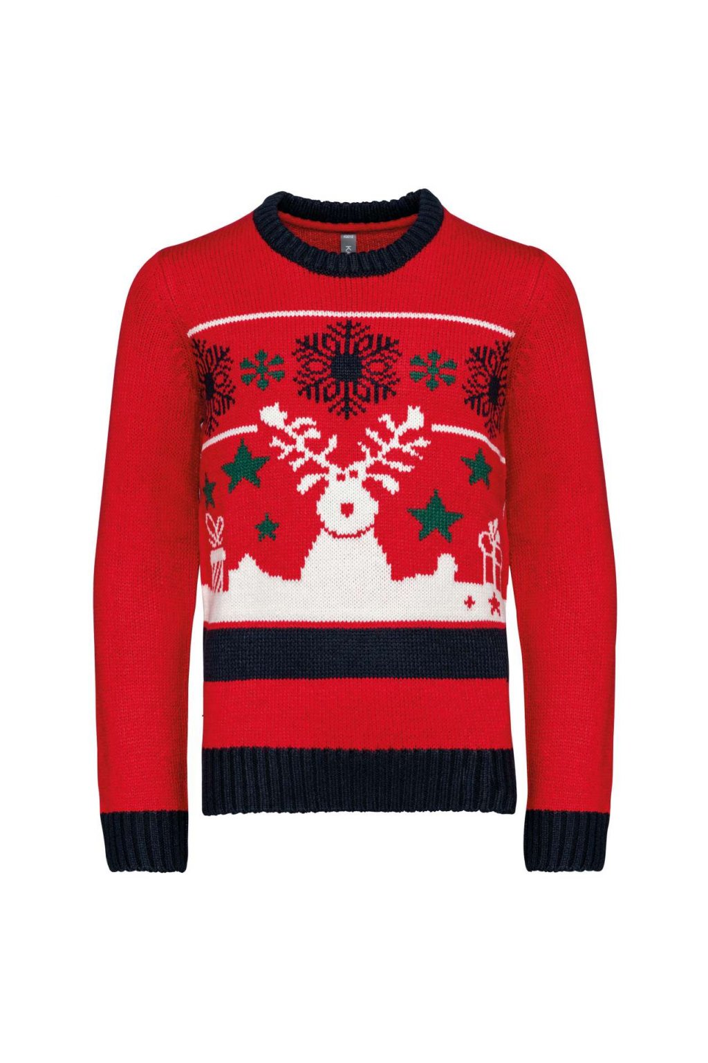 Vánoční dětský svetr potěší vaše děti veselým obrázkem soba a budou ho chtít nosit nejen o vánocích. Svetr je rovného střihu. Na přední straně je obrázek dárků, soba a vloček. Výstřih, manžety a spodní lem jsou žebrované a mají kontrastní barvu a jsou s obsahem elastanu, aby se zabránilo ztrátě jejich tvaru.