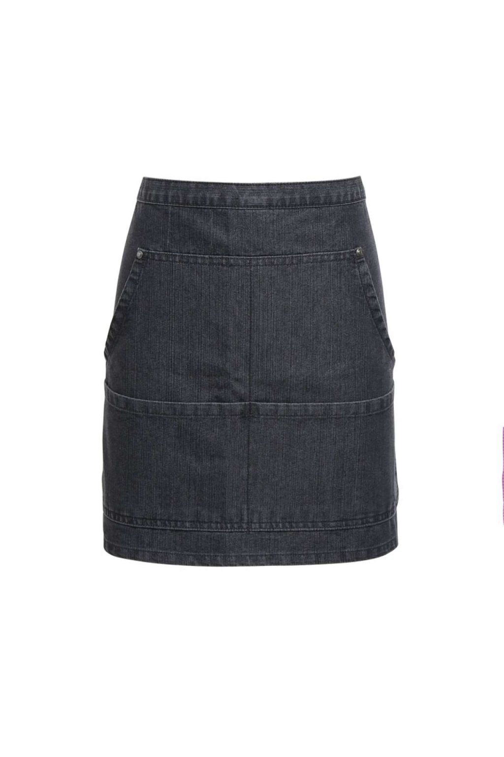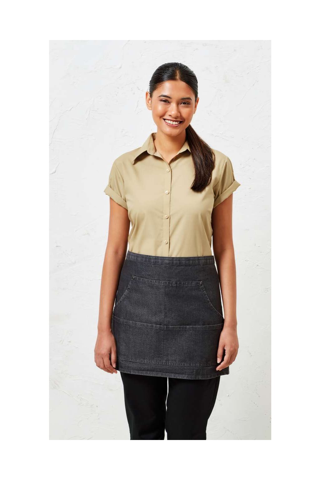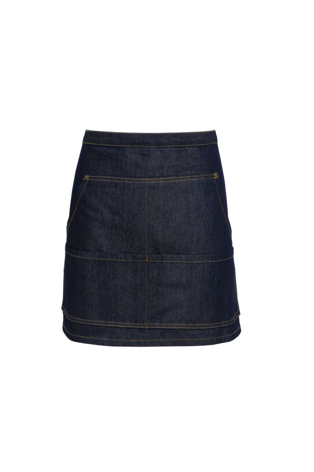 Moderní zástěra s kontrastním stehováním a čtyřmi kapsami má starožitné mosazné a stříbrné nýty, zavazovací pásky 106 cm dlouhé, horní kapsy mají šířku 24 cm a hloubku 27 cm, spodní kapsy šířku 24 cm a hloubku 16 cm.