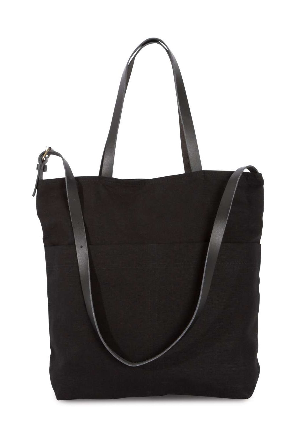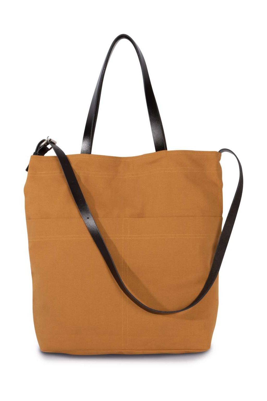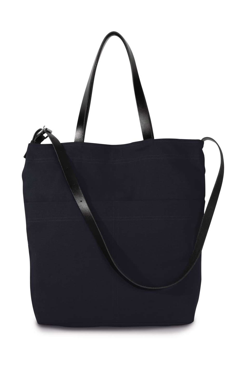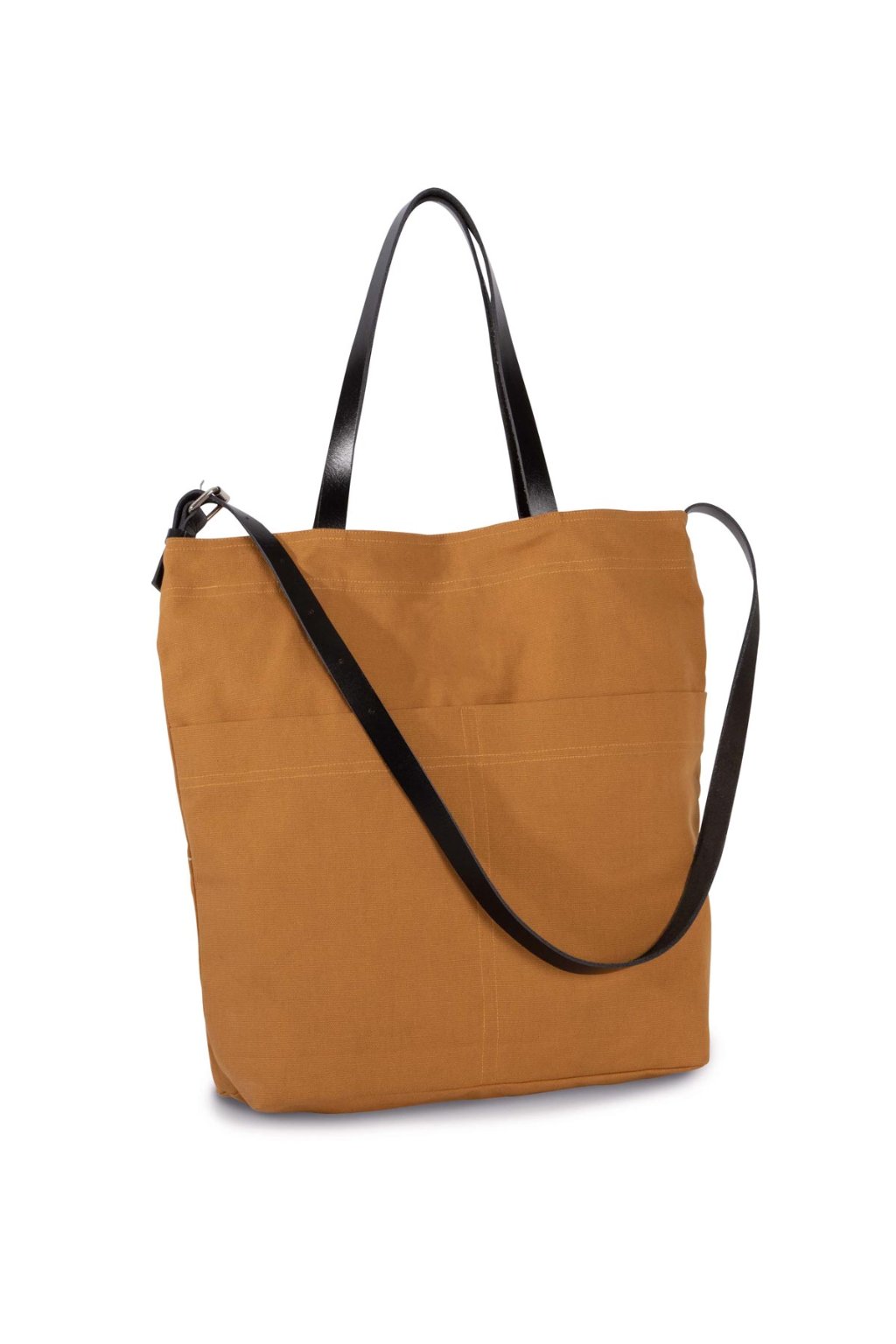 Bavlněná plátěná kabelka s koženými rukojeťmi a ramenním popruhem. Kabelka má velké přední kapsy, vnitřní kapsu a zapínání na magnetický knoflík.