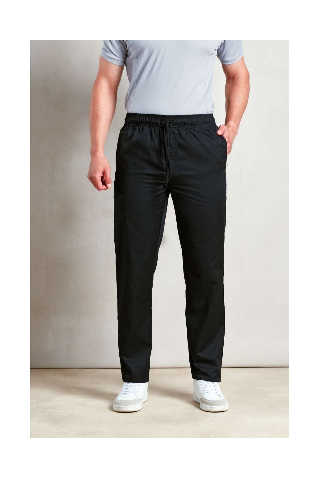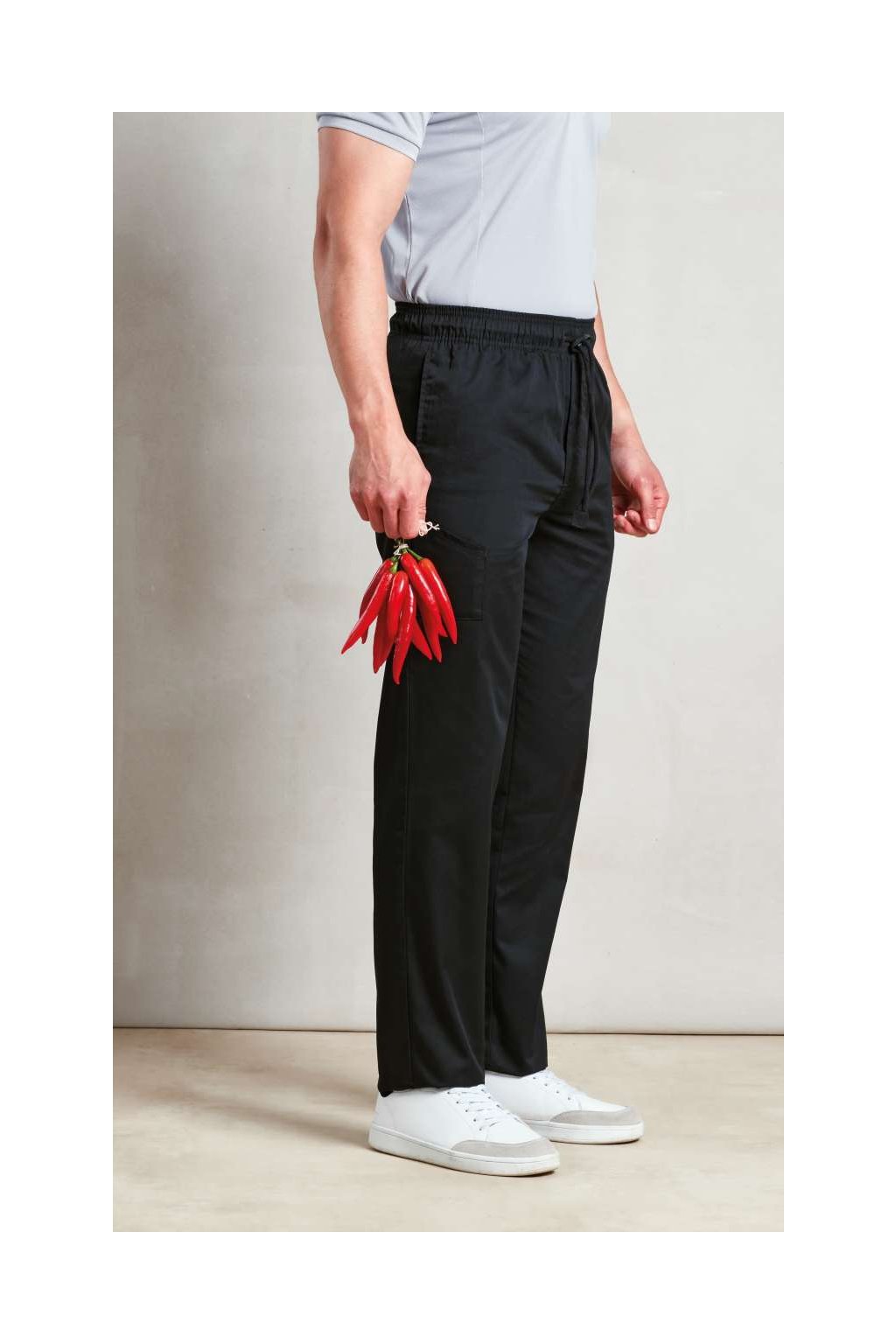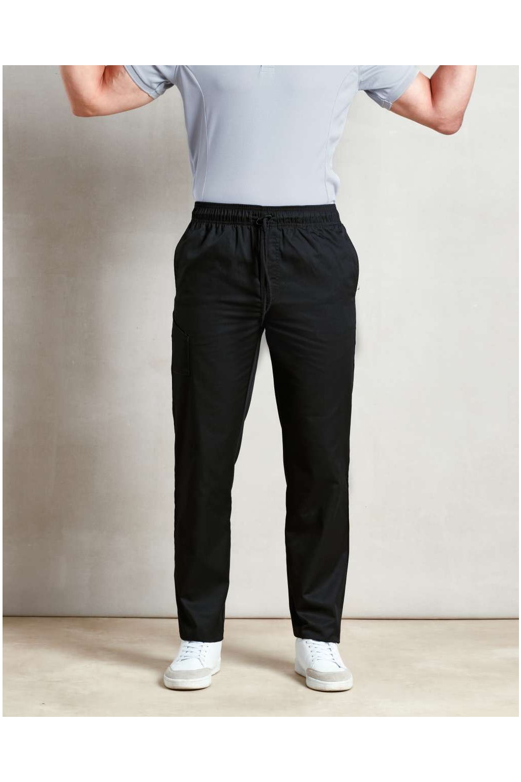 Kuchařské pracovní kalhoty skvěle padnoucího střihu s elastickým pasem mají krytý zip a stahovací šňůrku. Nechybí ani zadní kapsa.