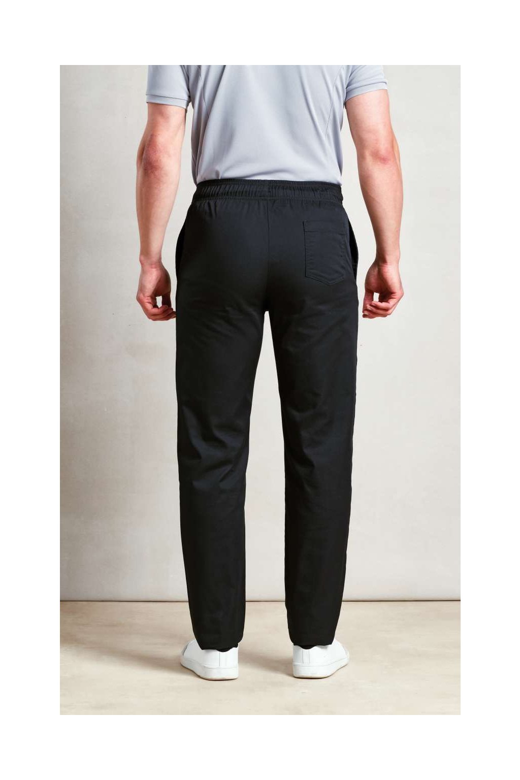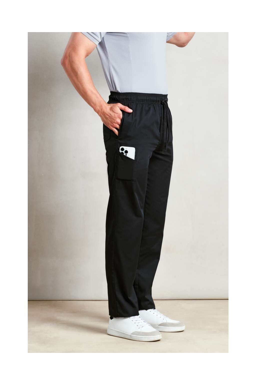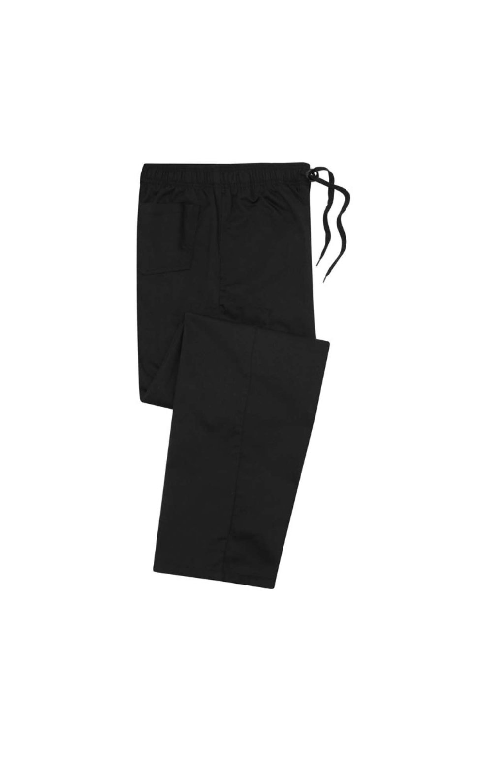 Kuchařské pracovní kalhoty skvěle padnoucího střihu s elastickým pasem mají krytý zip a stahovací šňůrku. Nechybí ani zadní kapsa.