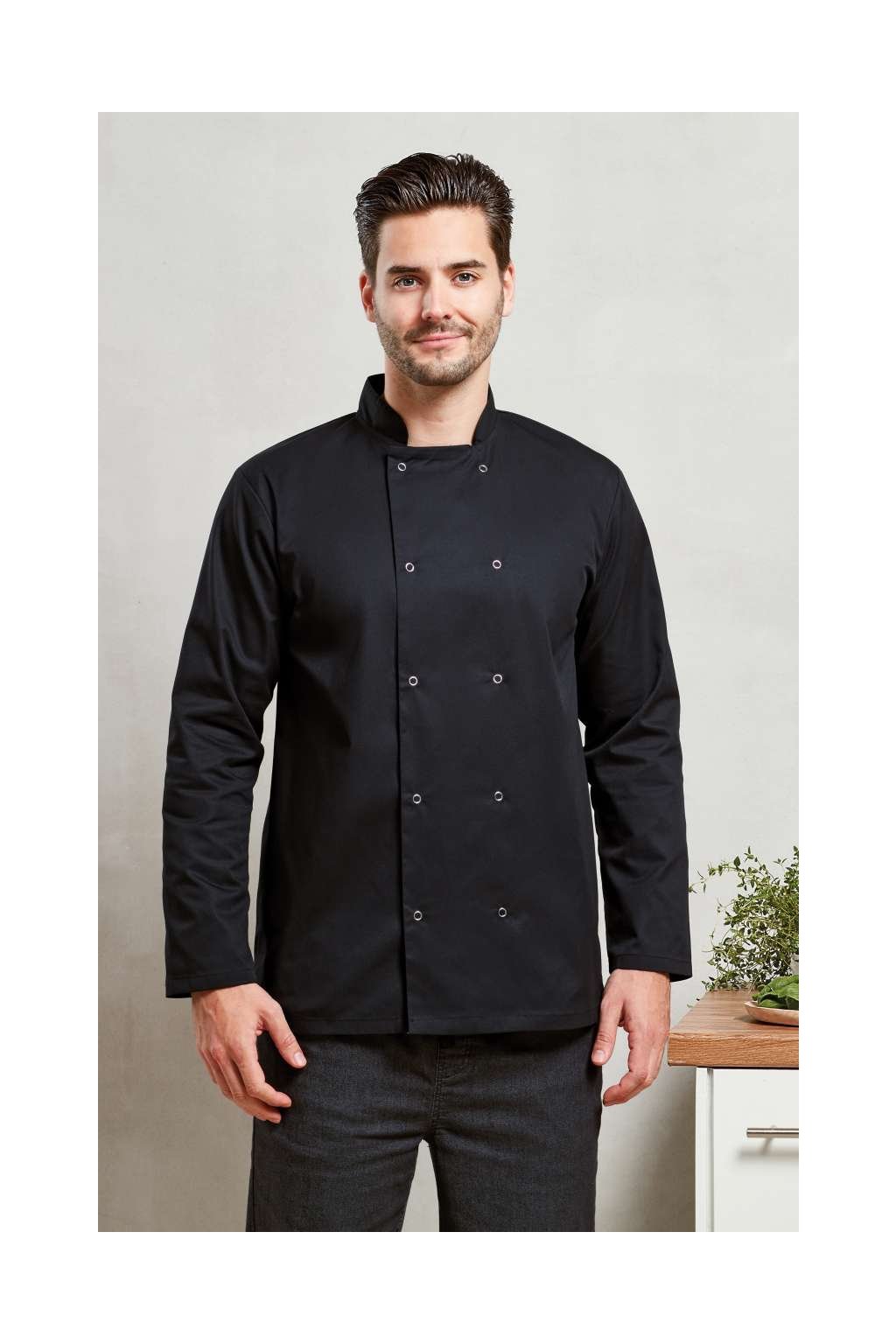 Unisexový kuchařský rondon je velmi příjemný na dotyk. Má prošitý stojáček, který je velmi slušivý. Zapíná se na patenty.