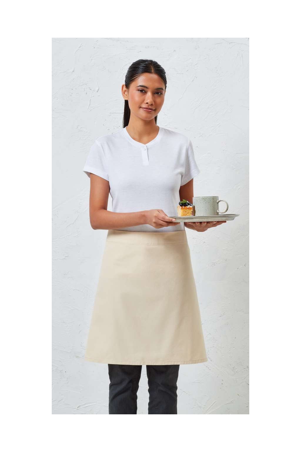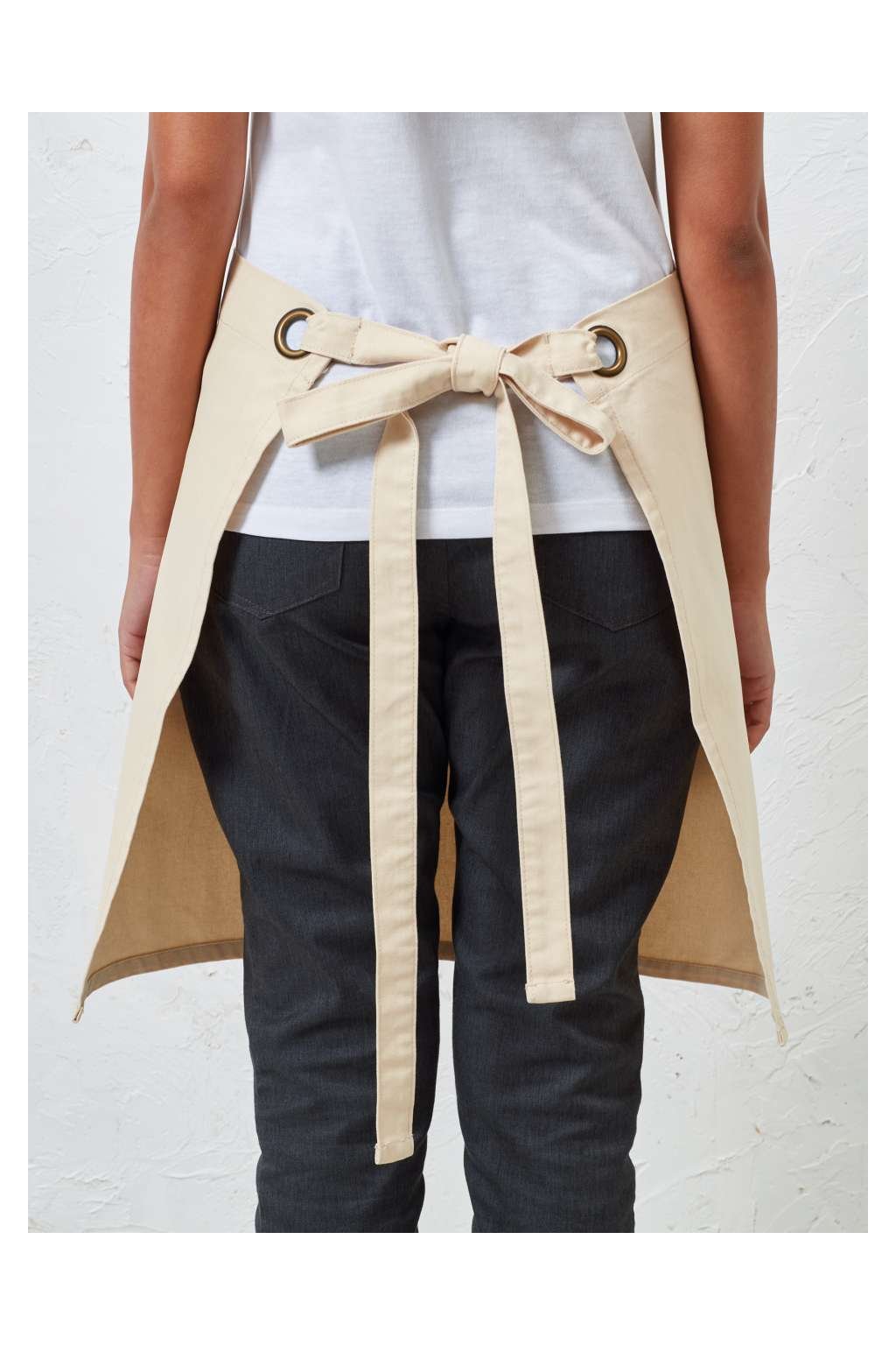 Zástěra do pasu střední délky z kvalitního plátna má 90 cm dlouhé pásky pro uvázání kolem pasu