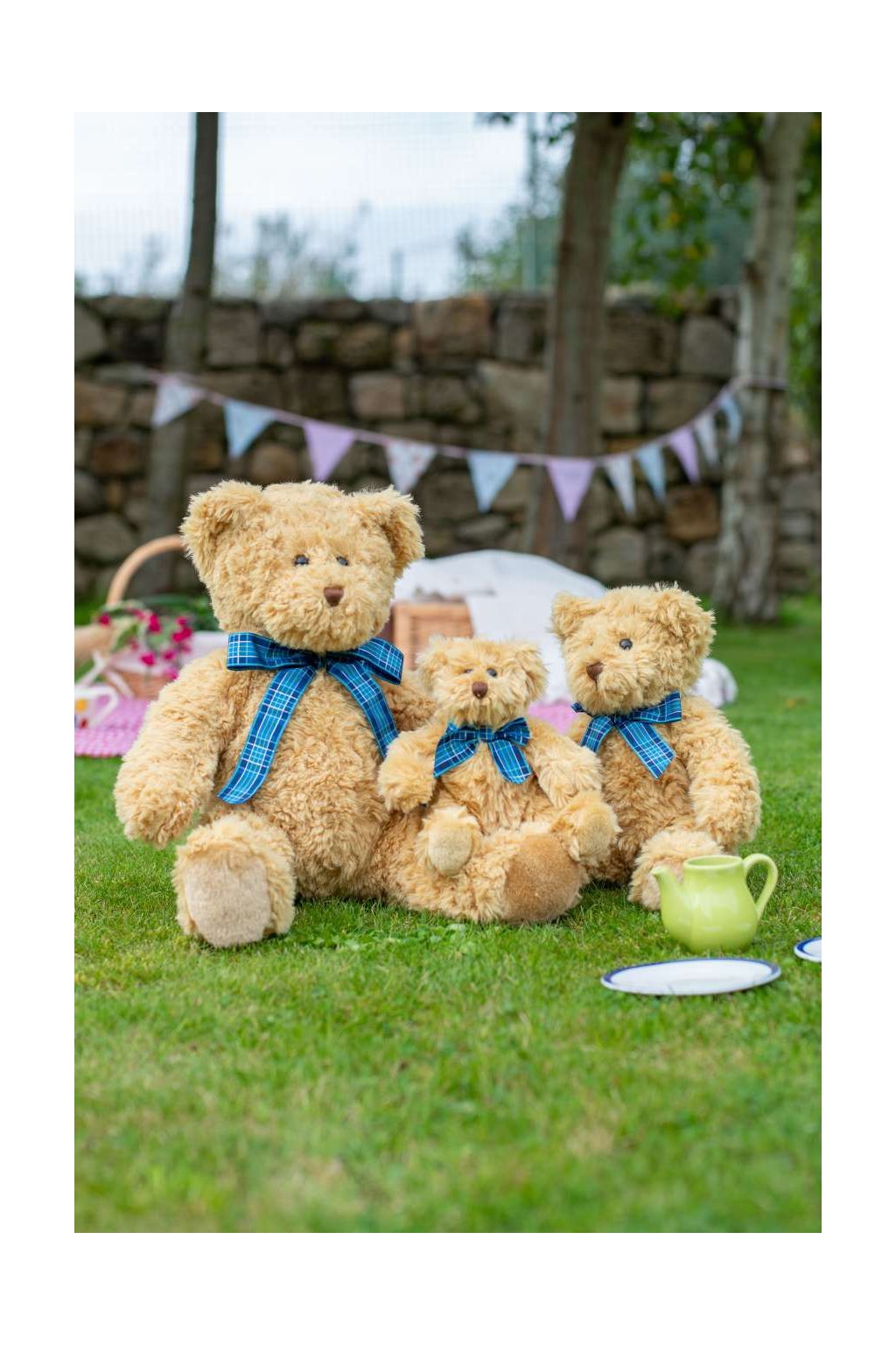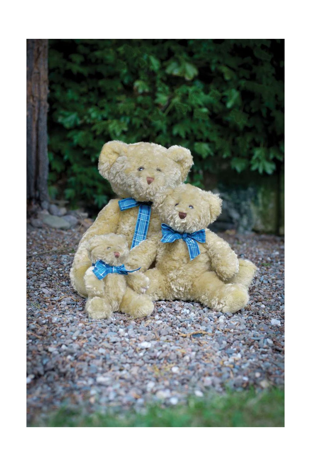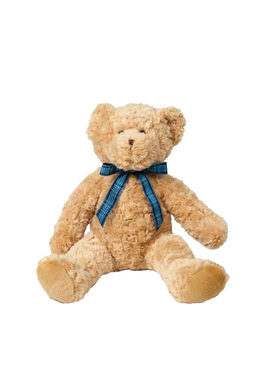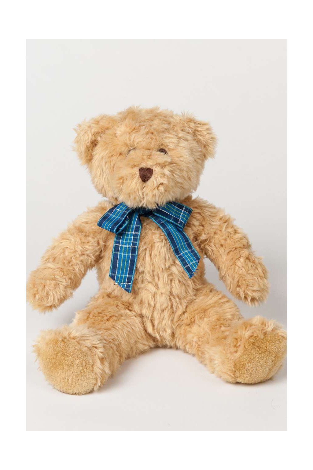 - Light brown bear with tartan ribbon