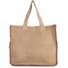 Nelaminovaná nákupní taška z juty s kontrastním prošitím jutové příze podél okrajů. Vnitřní kapsa z juty na zip a bavlněné ucho.