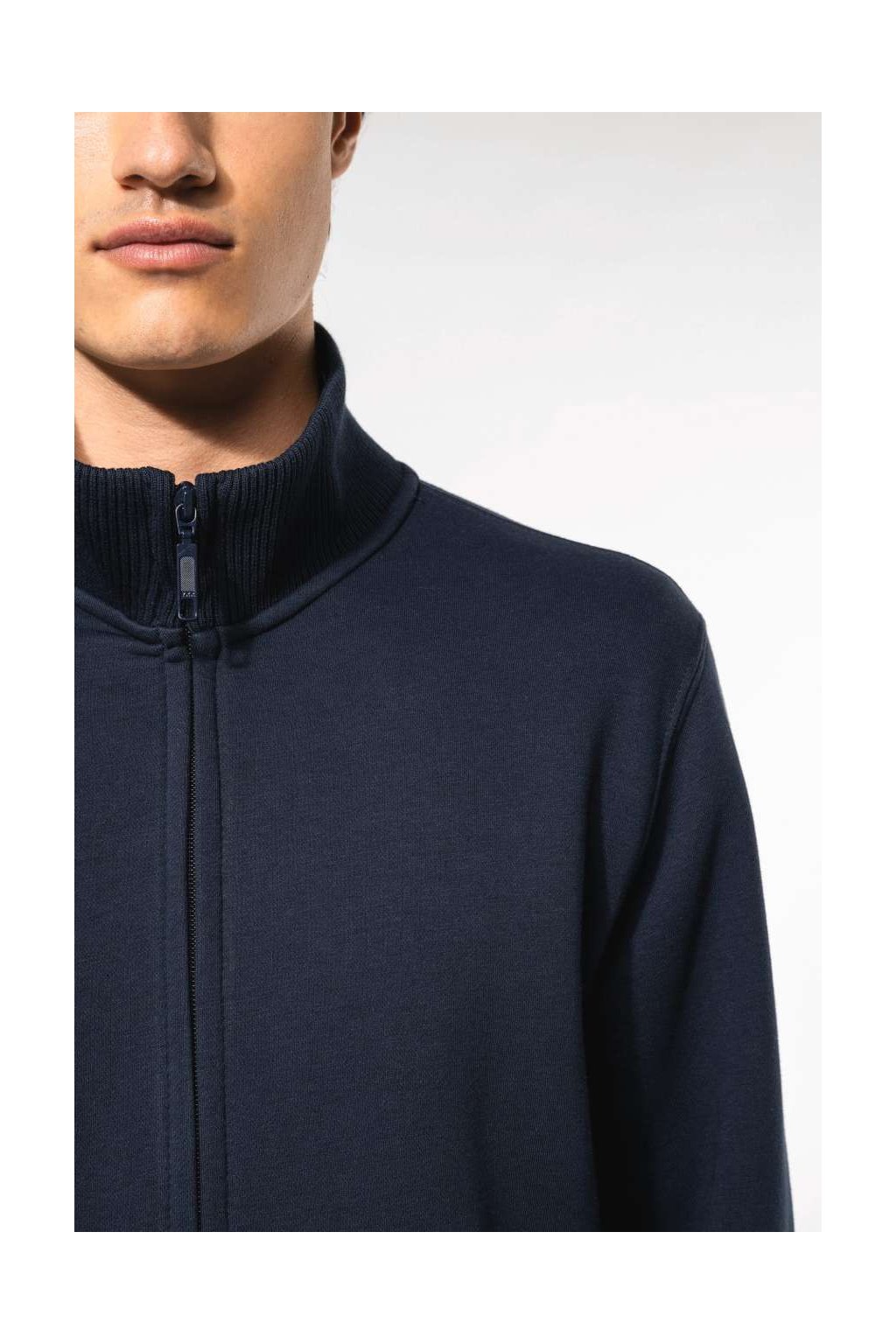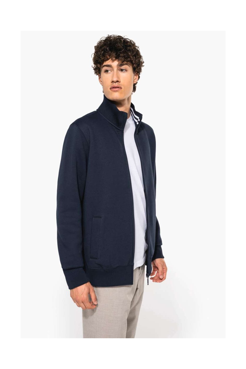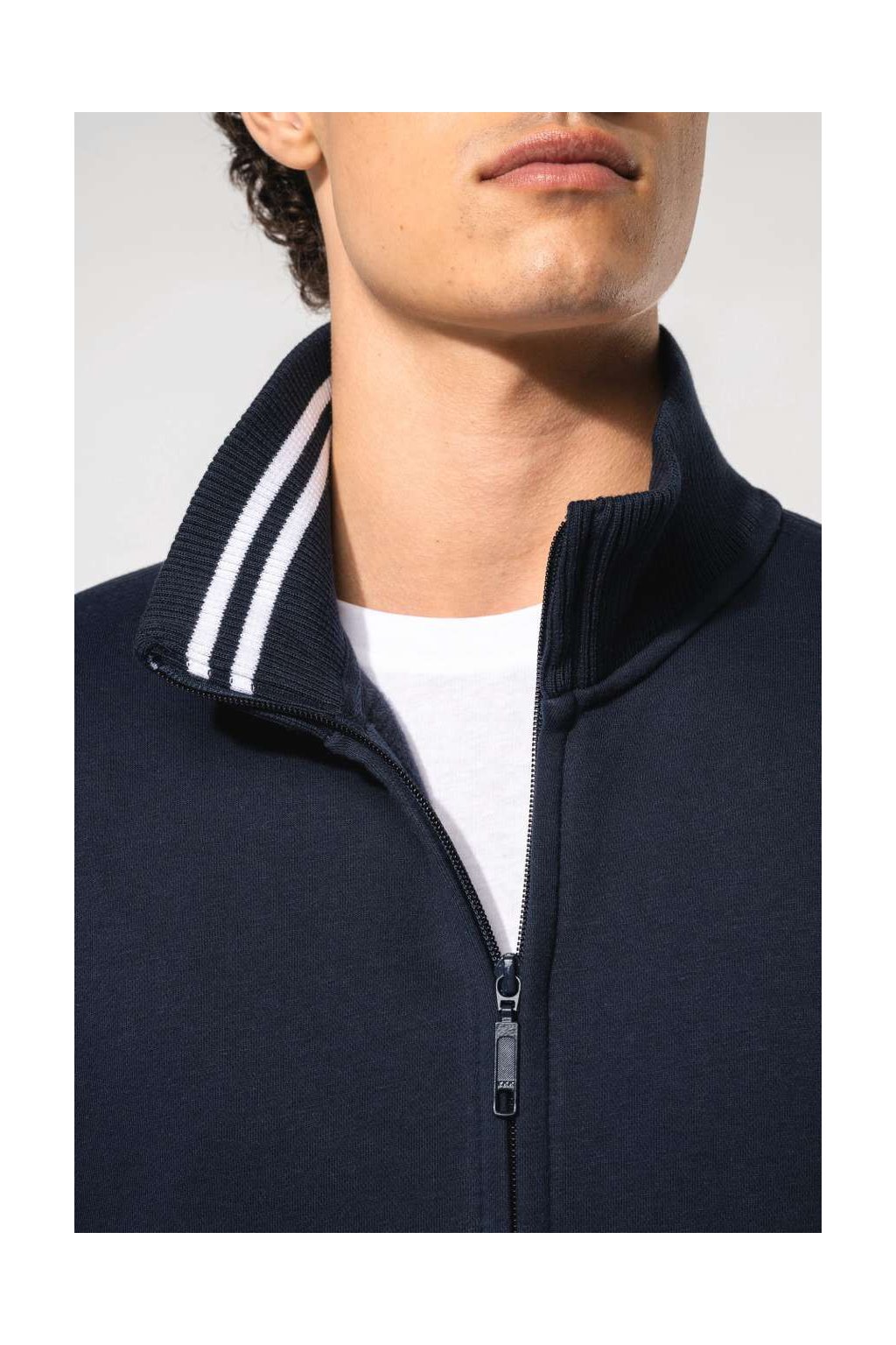 Velmi slušivá a hřejivá mikina se zapínáním až ke krku má kontrastní pruhovaný vnitřní límec (bílé proužky pro všechny barvy, kromě bílé mikiny, kde jsou pruhy šedé). Má dvě přední kapsy a žebrované manžety a lem. Z vntiřní strany je fleece.