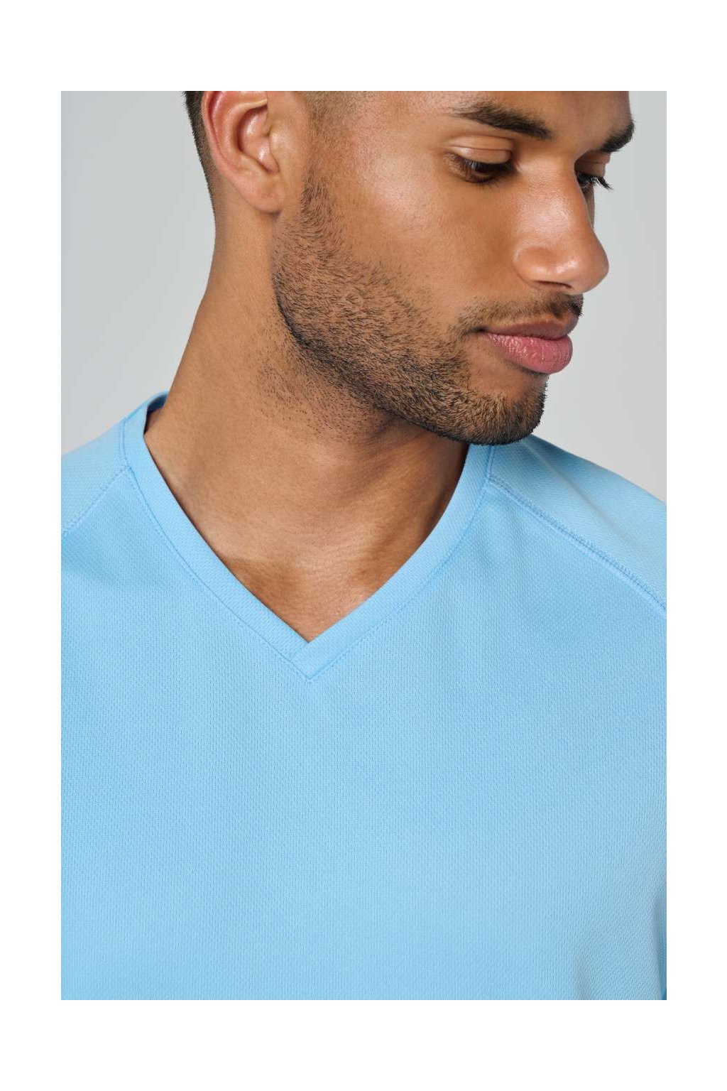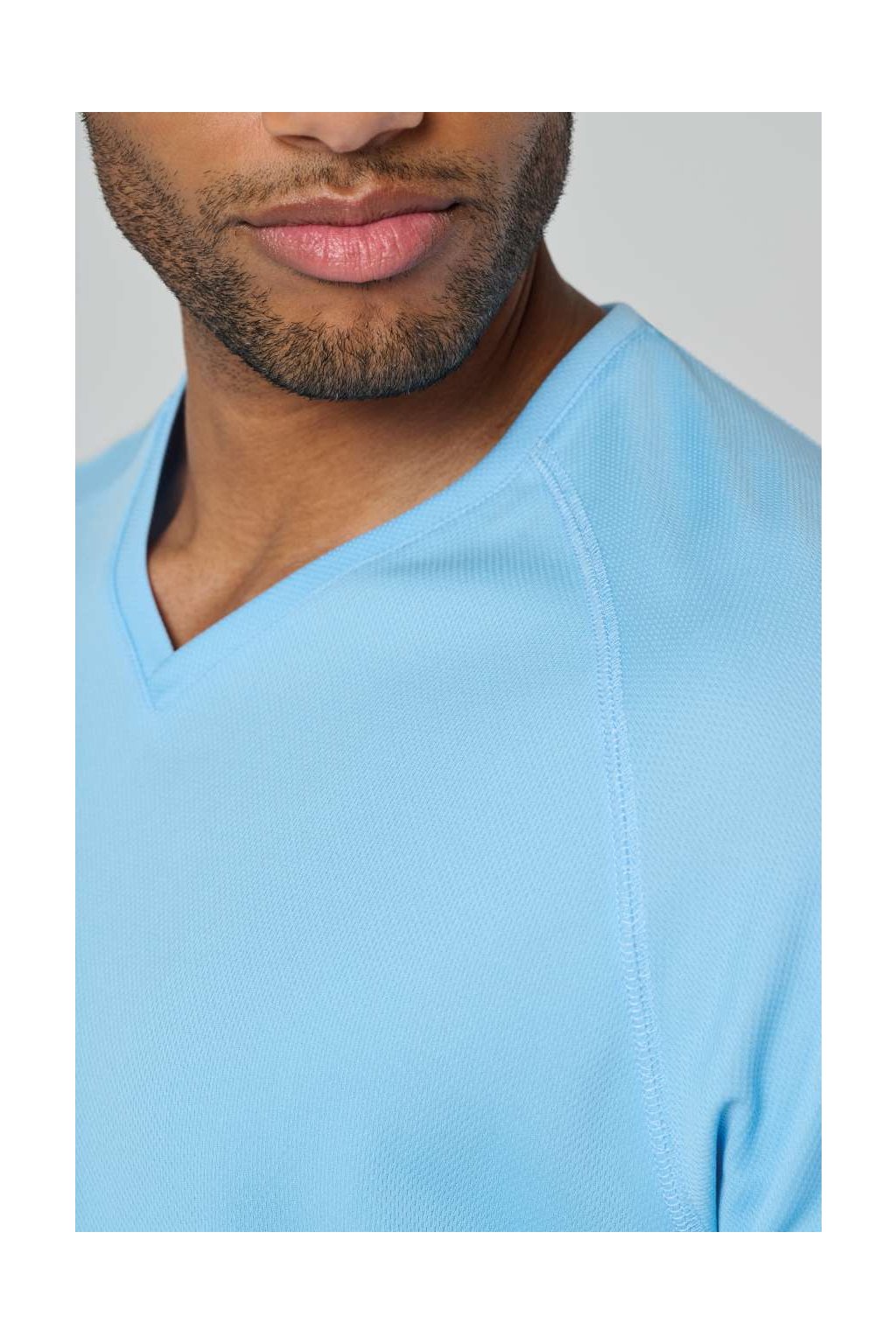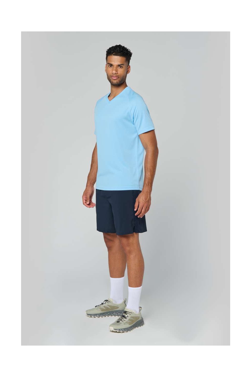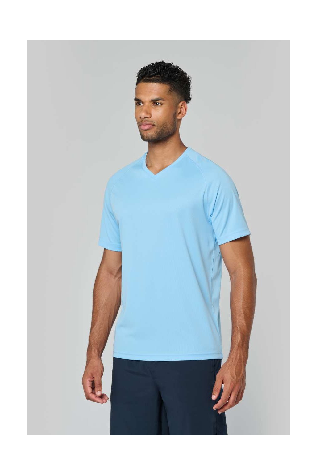 Pánské sportovní tričko s krátkým rukávem, s dvojitou jehlou na reglánových rukávech, detaily topstich, V - výstřih. Díky speciálním vlastnostem látky tričko nenavlhne, rychle se suší, je snadné na údržbu, velmi lehké a nemačkavé. Hodí se pro každou příležitost a pro spoustu sportovních aktivit. K dostání v mnoha barvách.