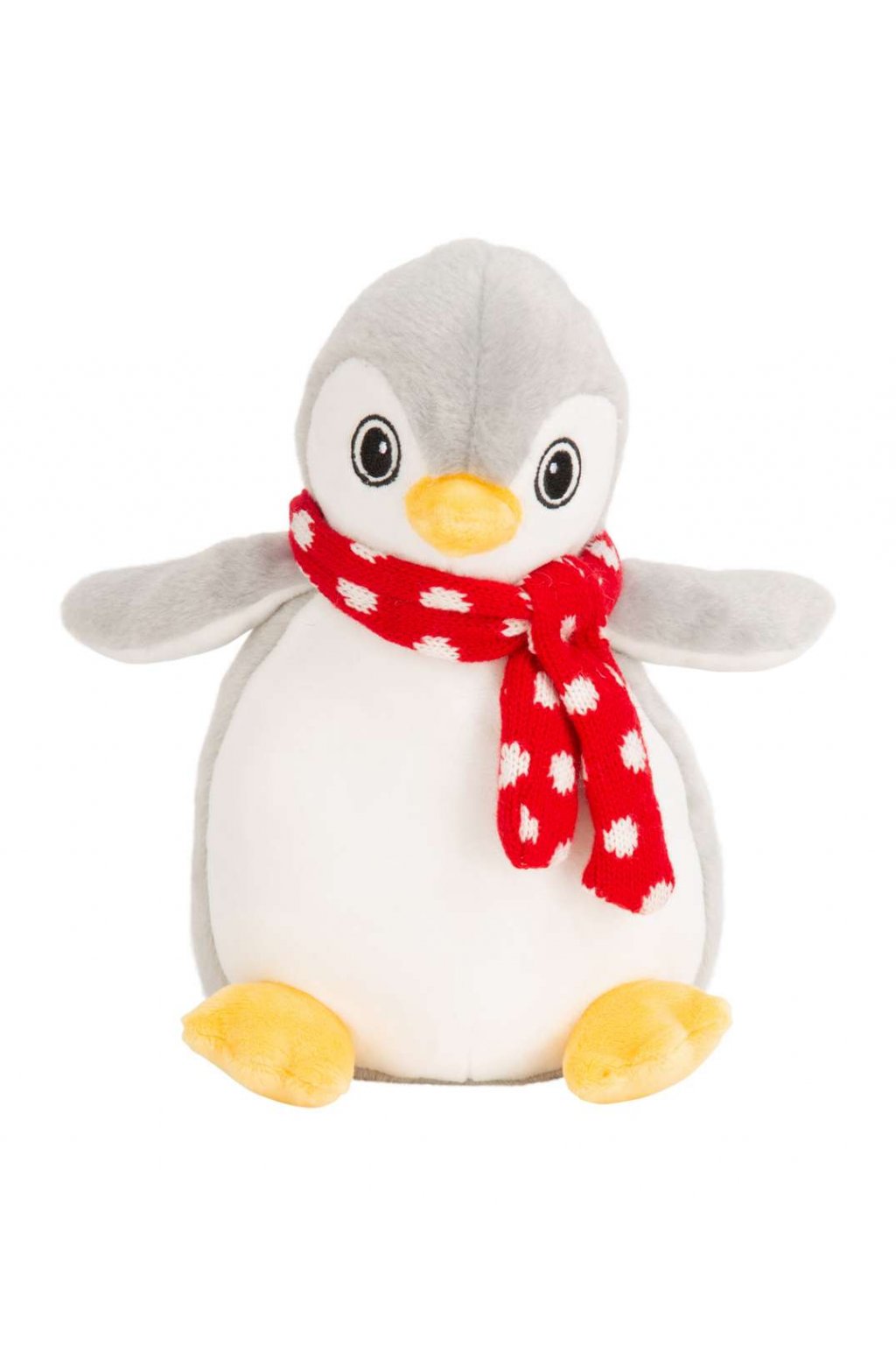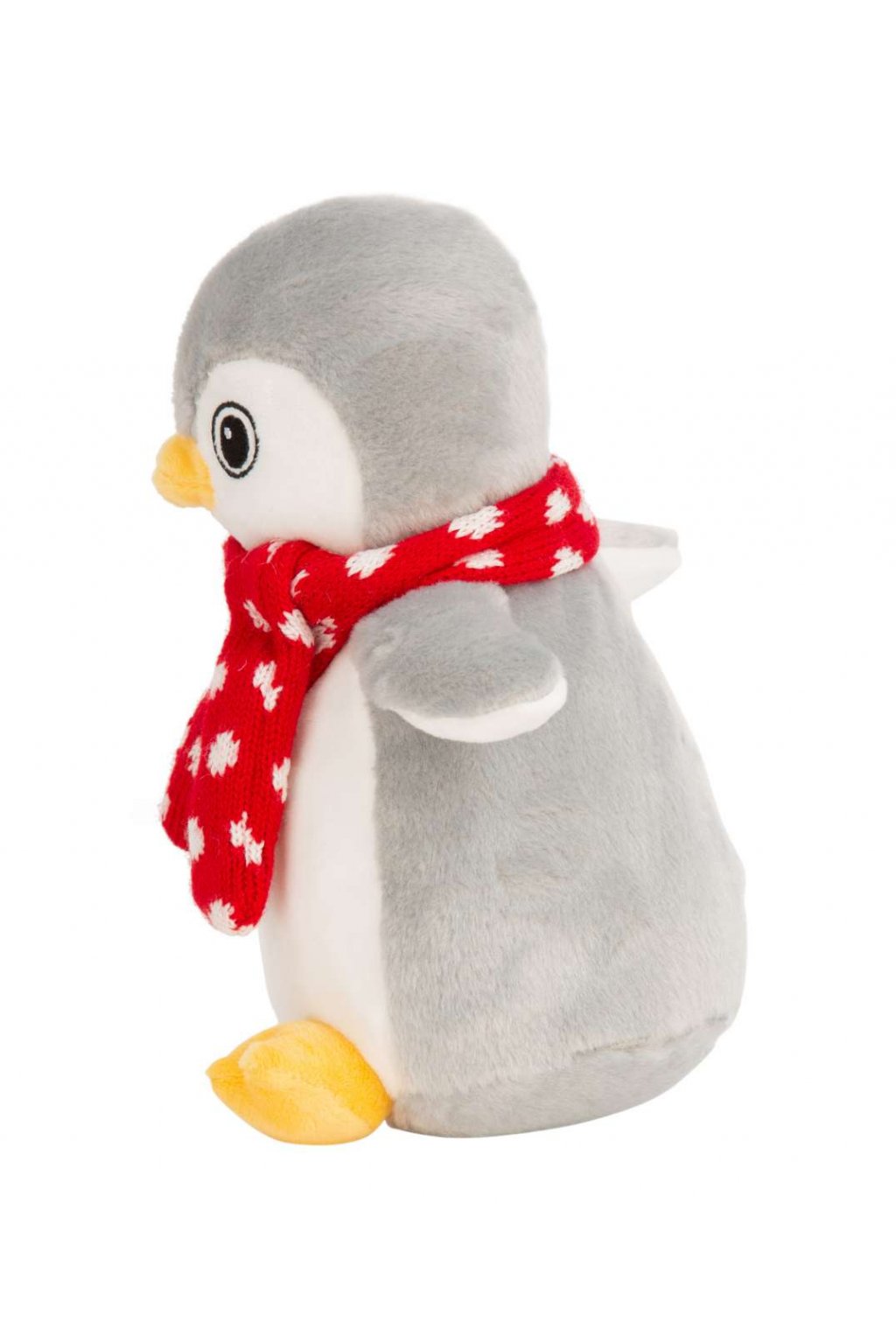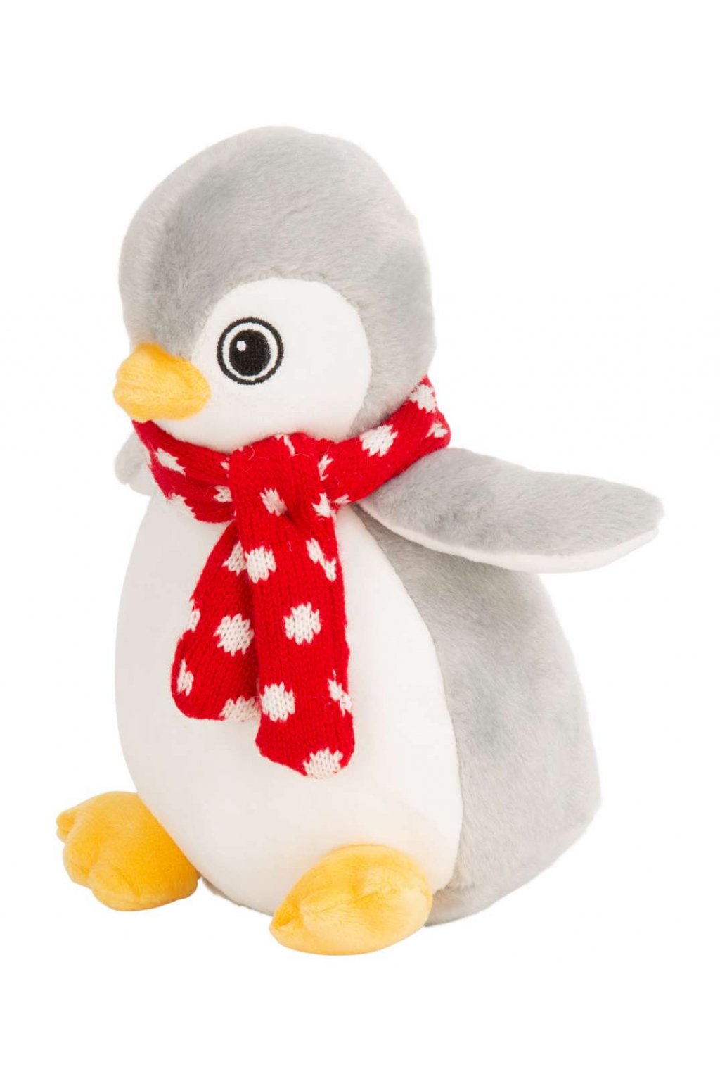 Hebký šedobílý plyšový tučňák udělá radost v každém věku. Tučňáka zdobí červená šálka kolek krku.