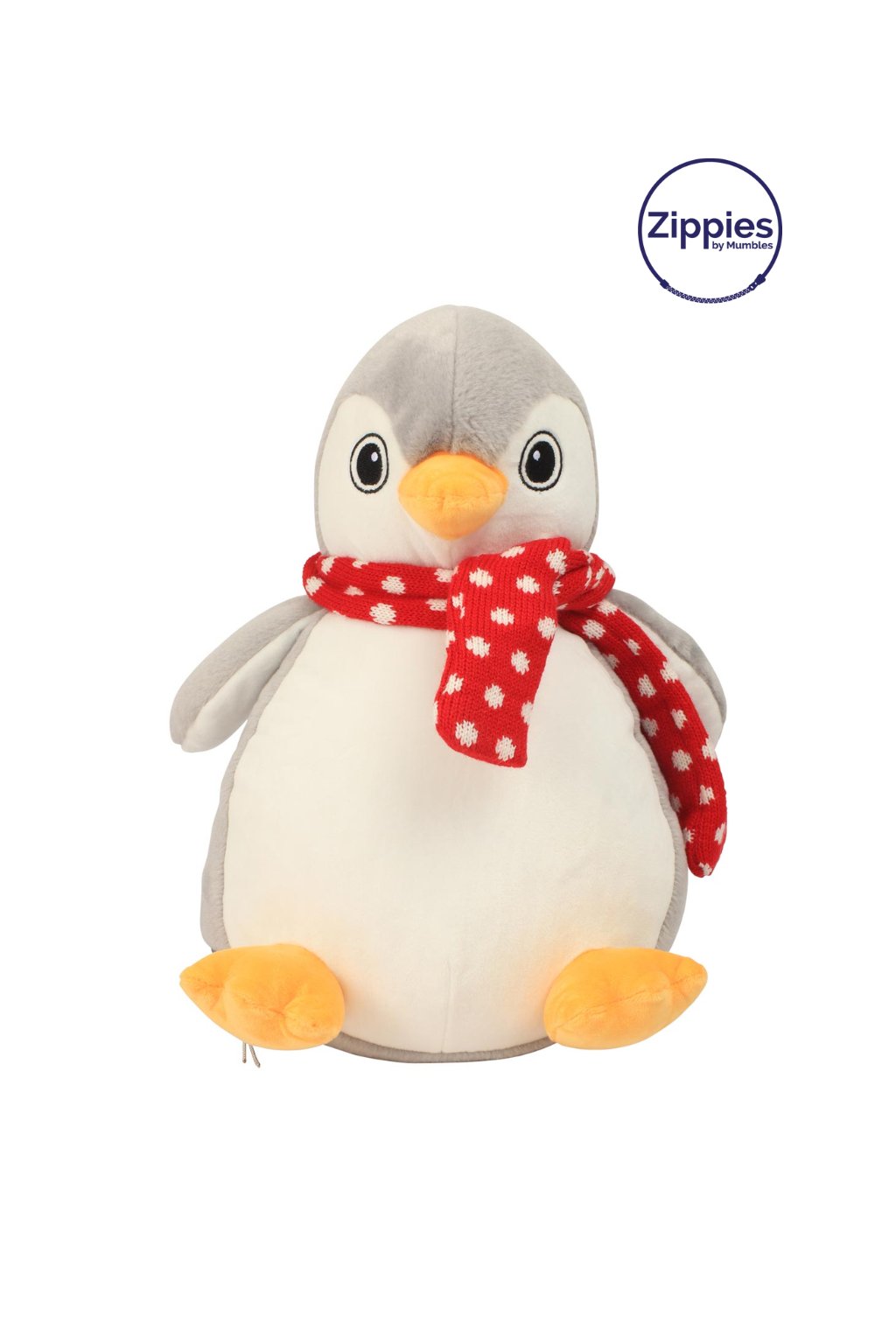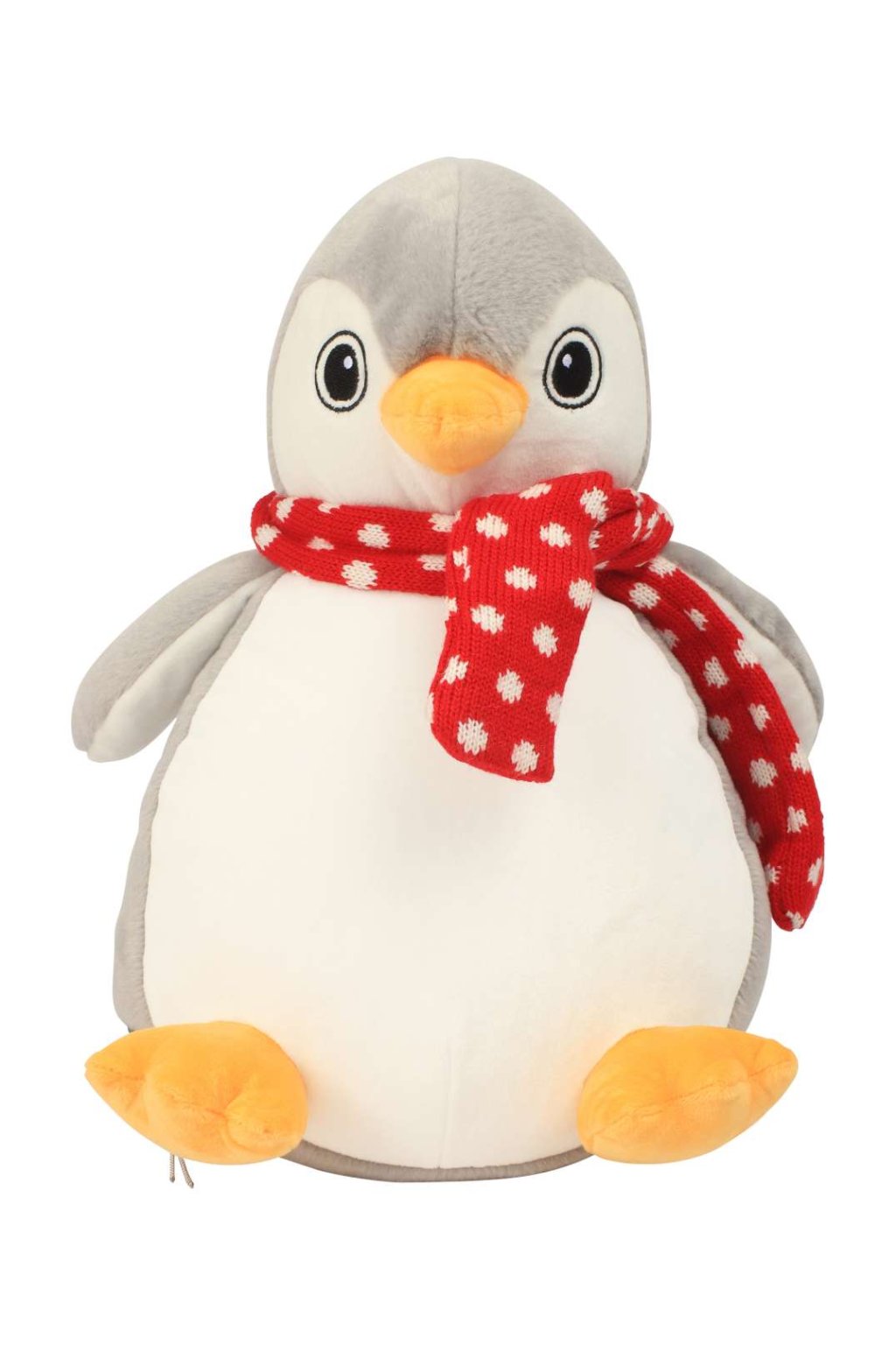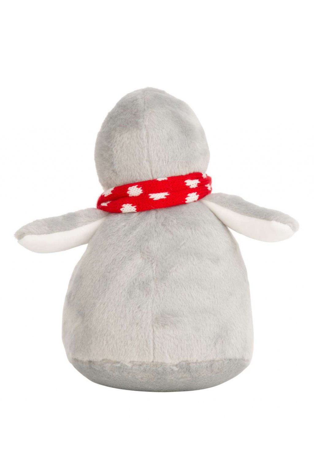 Hebký šedobílý plyšový tučňák udělá radost v každém věku. Tučňáka zdobí červená šálka kolek krku.