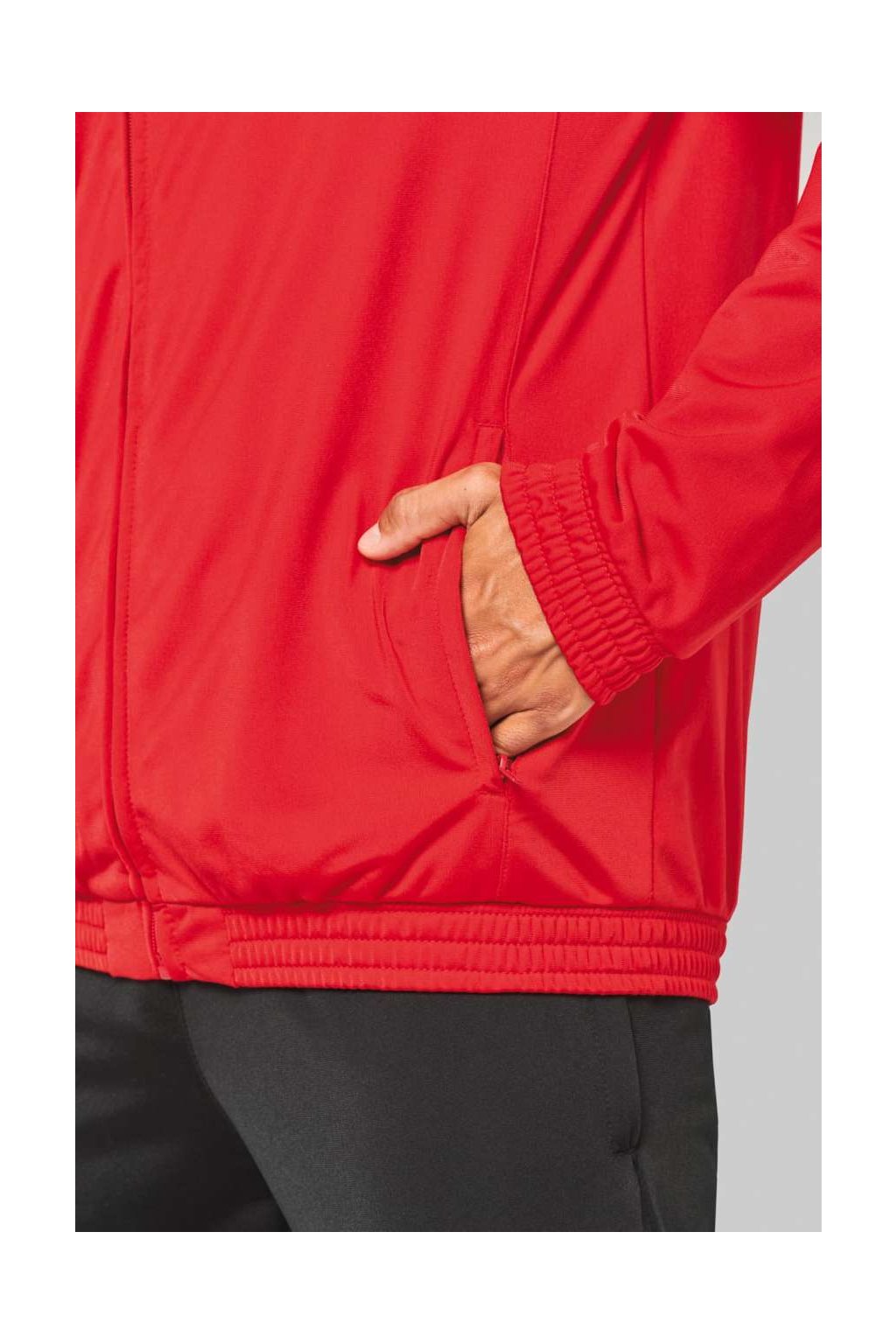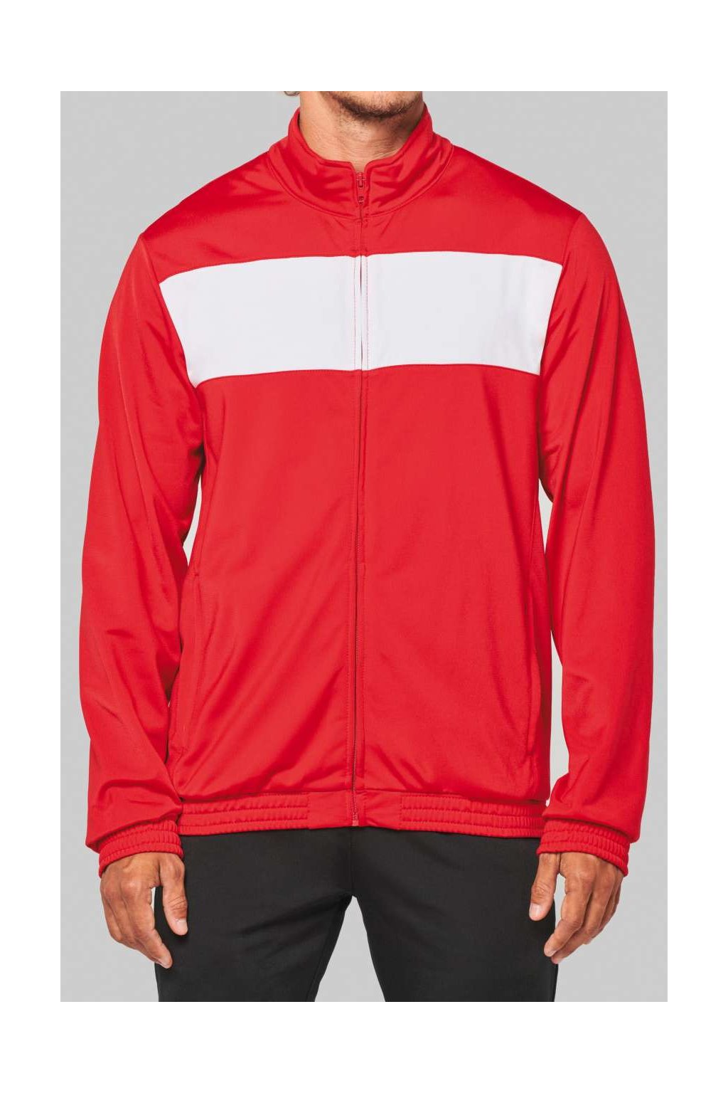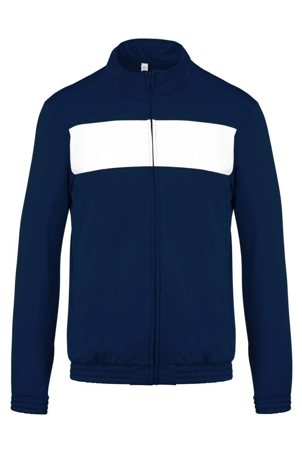 Sportovní mikina s širokým kontrastním vodorovným pruhem v přední části, dlouhý rukáv, boční šev, vhodná do kombinace do soupravy, elastický pas se stahovací šňůrkou, dvě boční kapsy na zip, moderní slim fit střih.