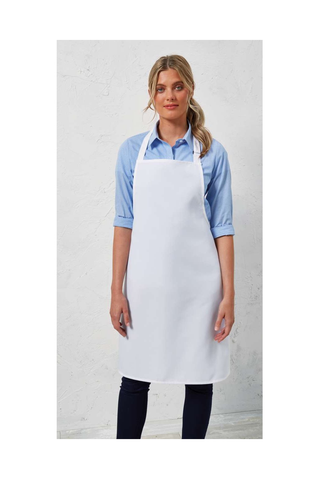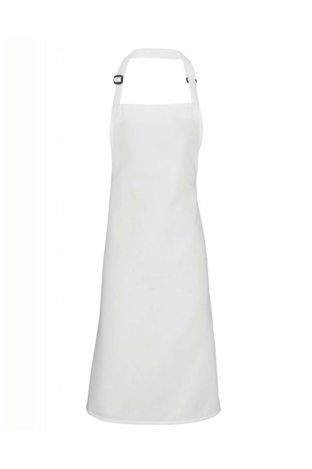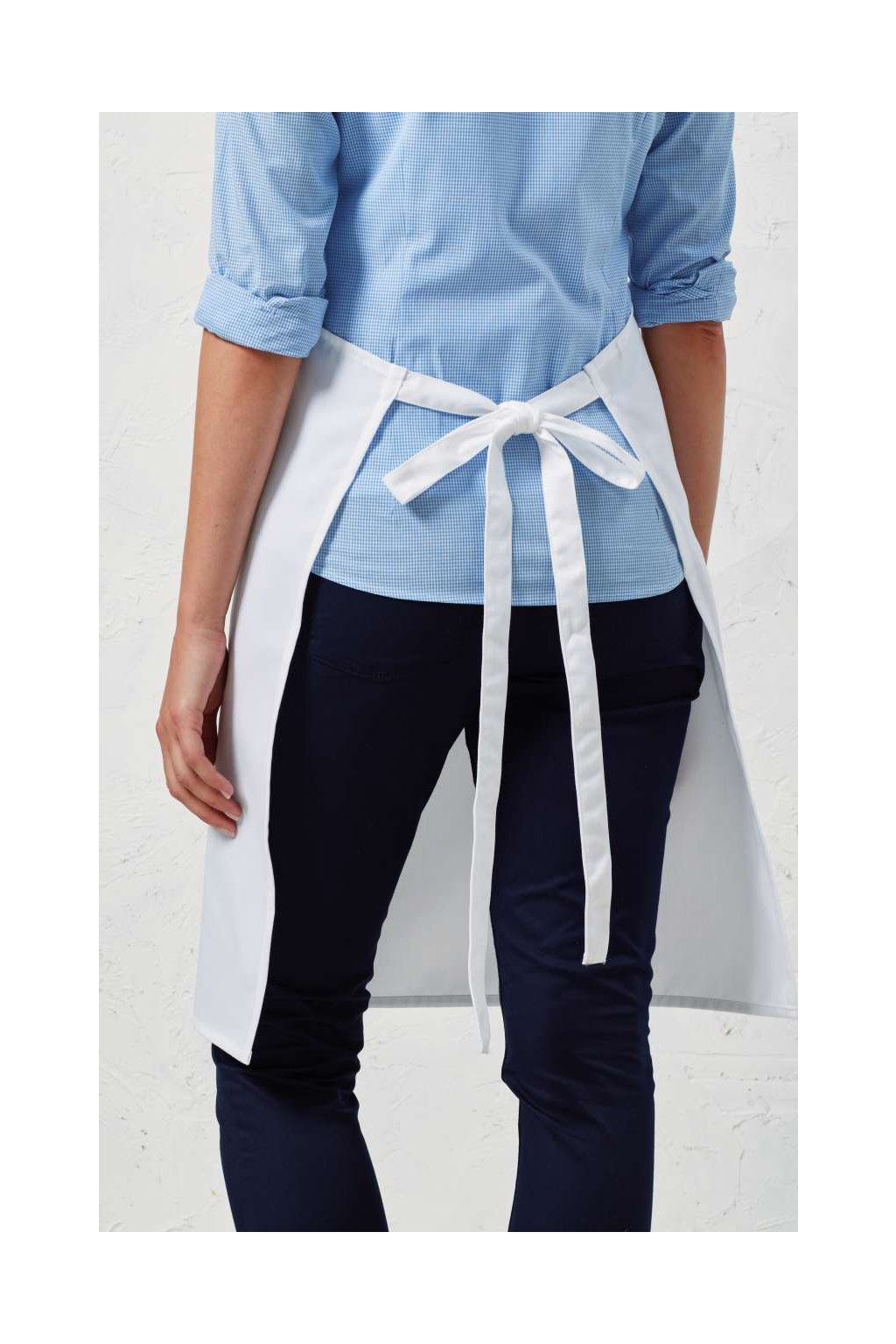 Praktická zástěra z pevného kepru má nastavitelnou posuvnou přezku na nákrčníku a pásky na stažení vzadu na zástěře dlouhé 90 cm.