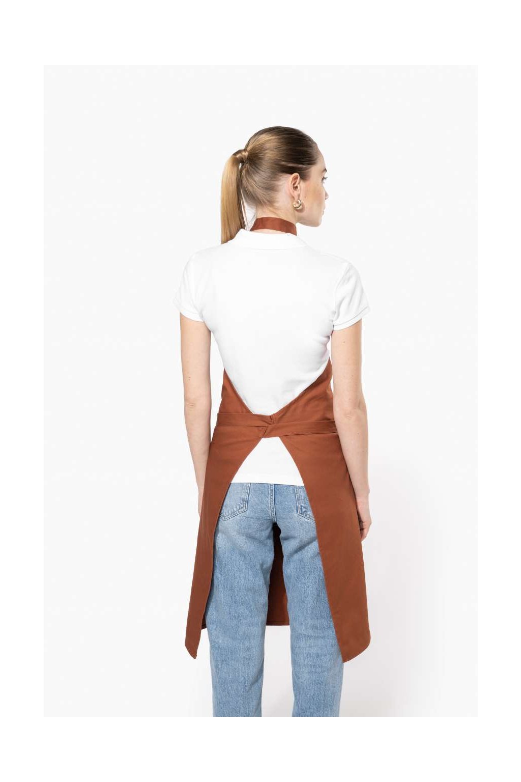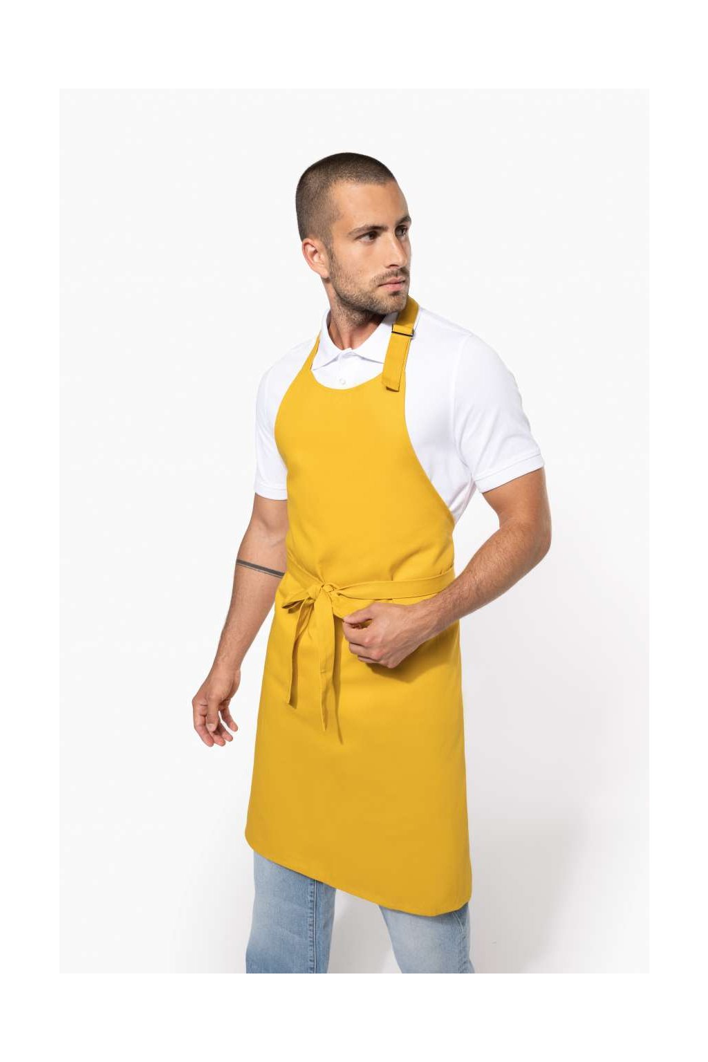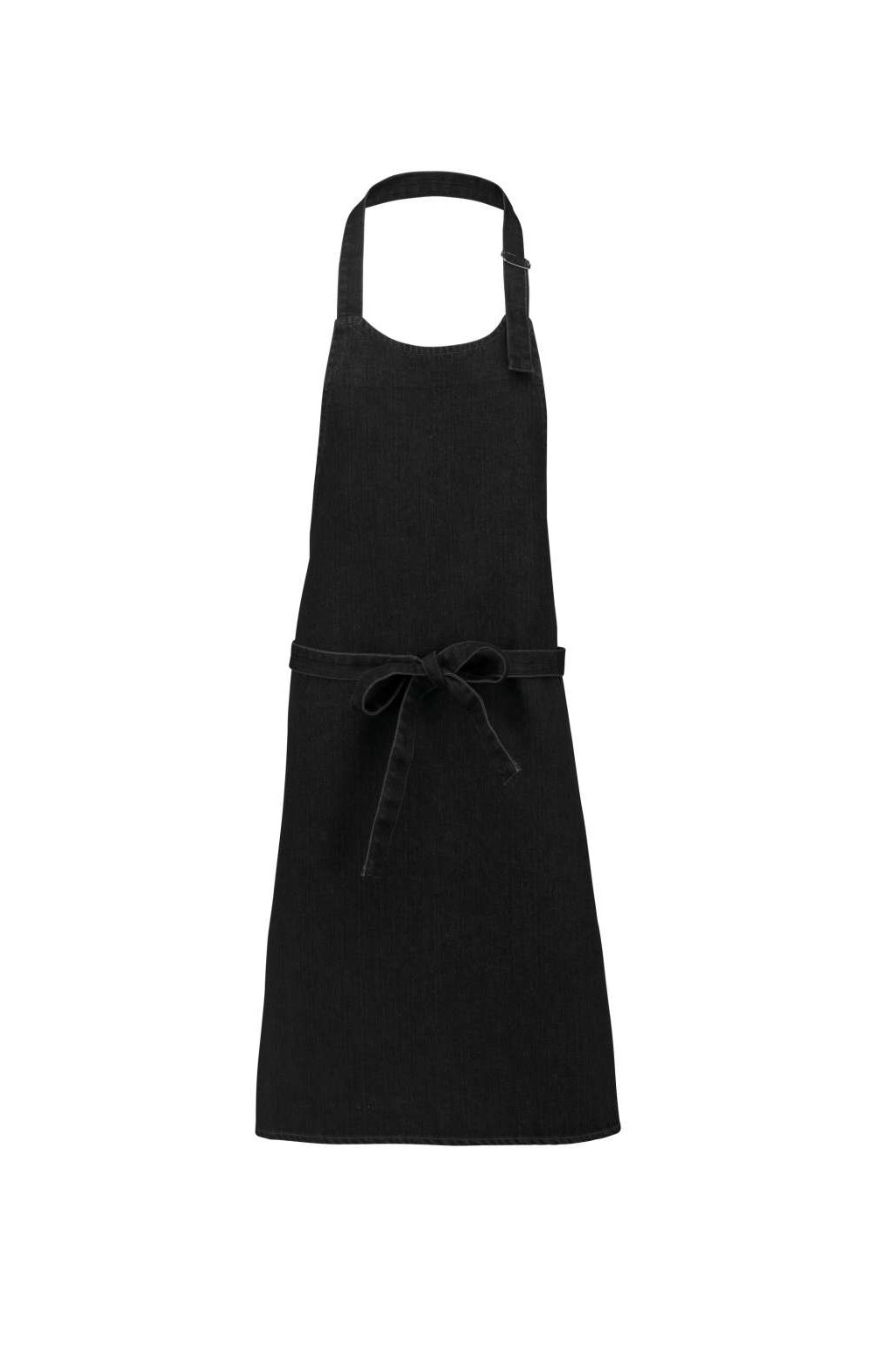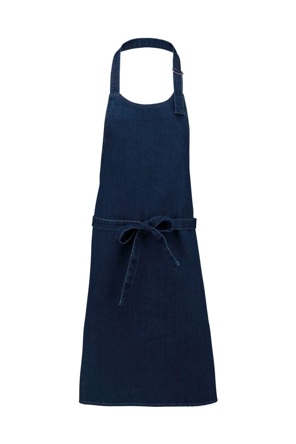 Univerzální bavlněná zástěra bez kapes. Délku lze nastavit pomocí posuvné kovové spony. Denimové barvy: specíální ošetření s úmyslem vypadat opotřebovaně. Prát lze na 60°C.