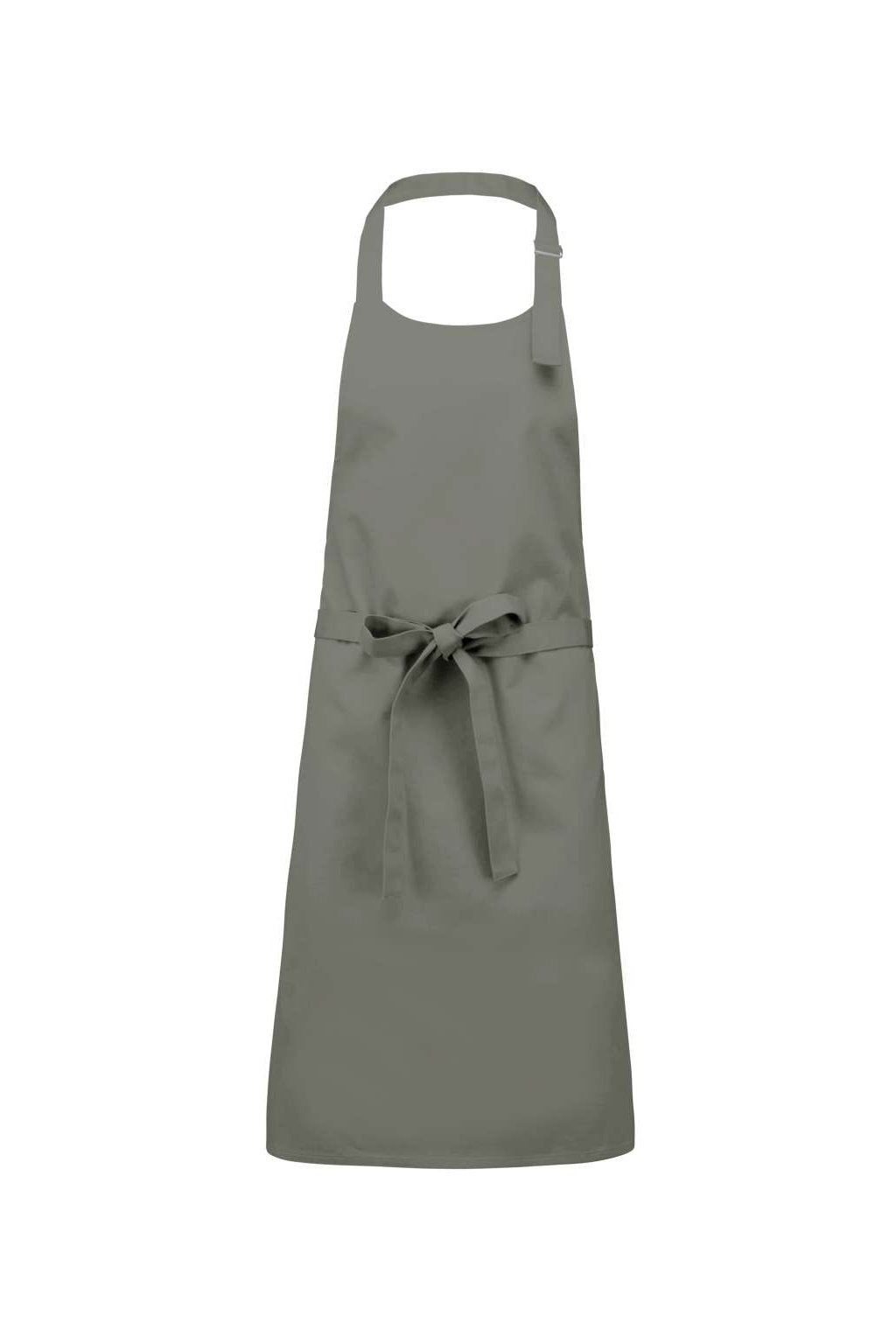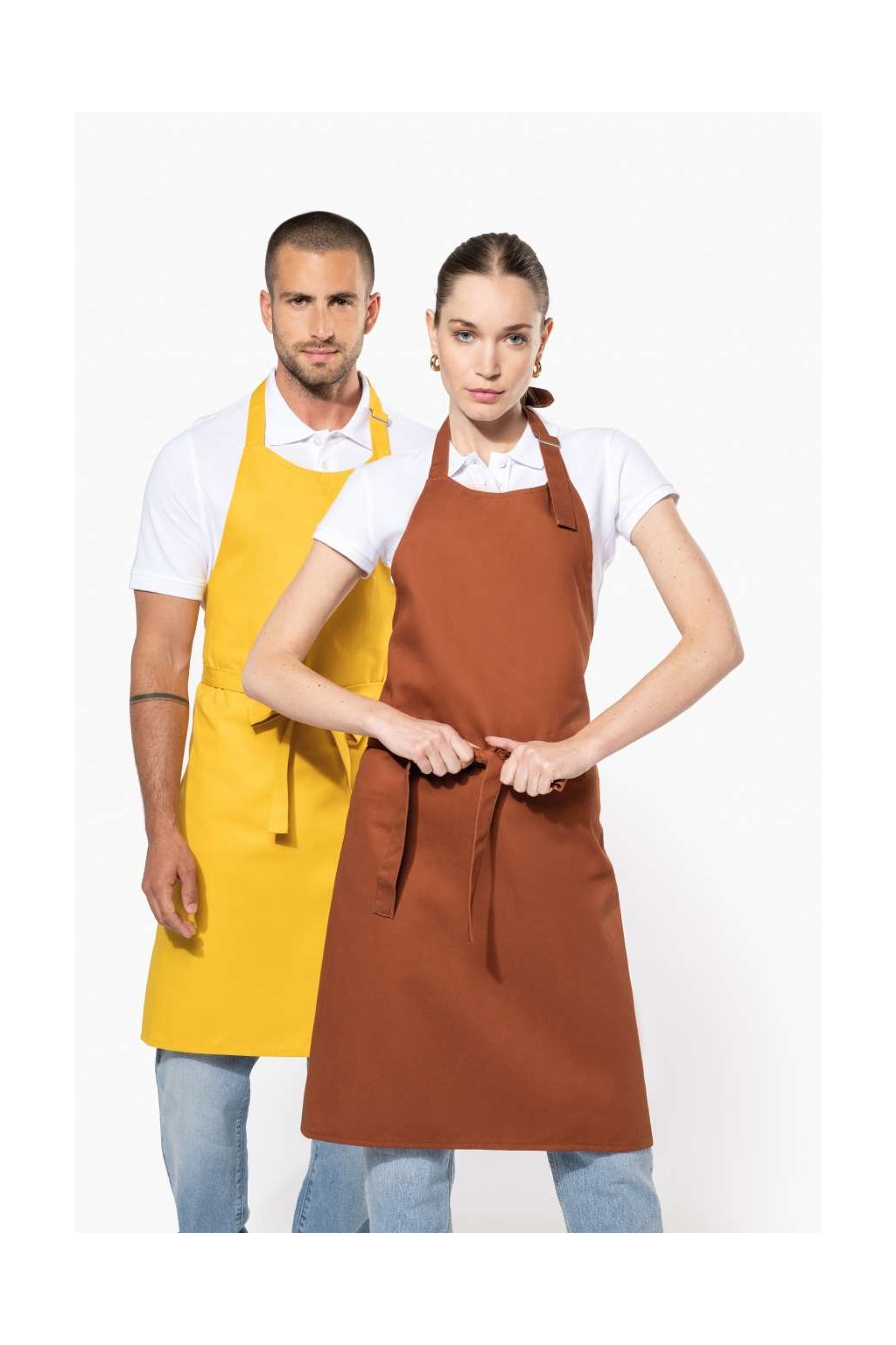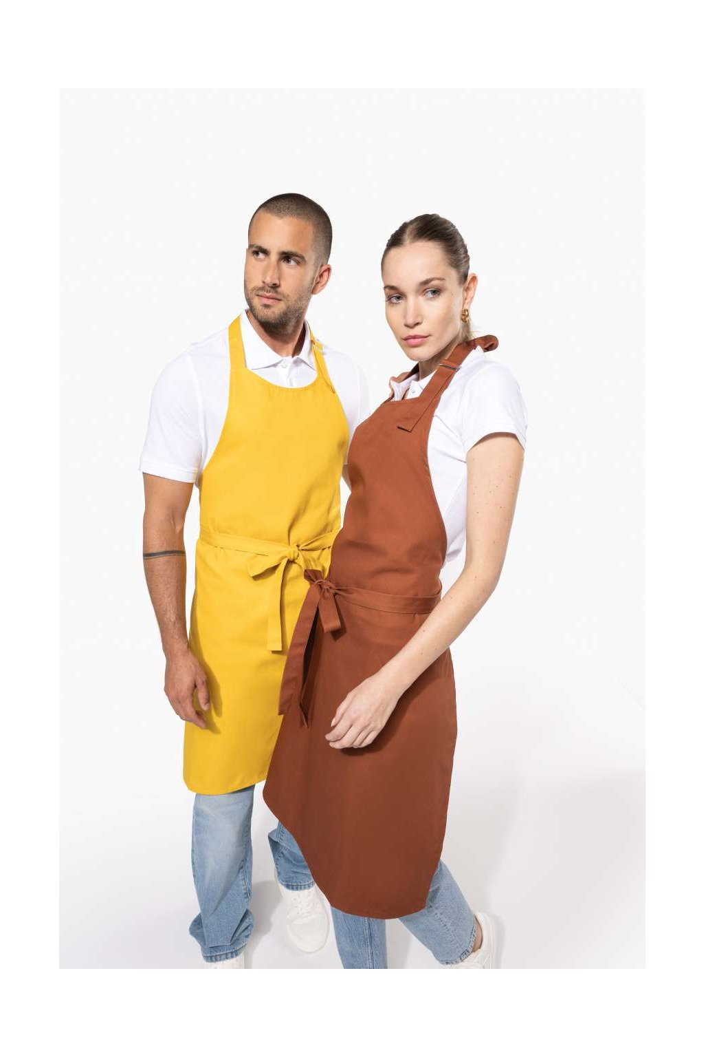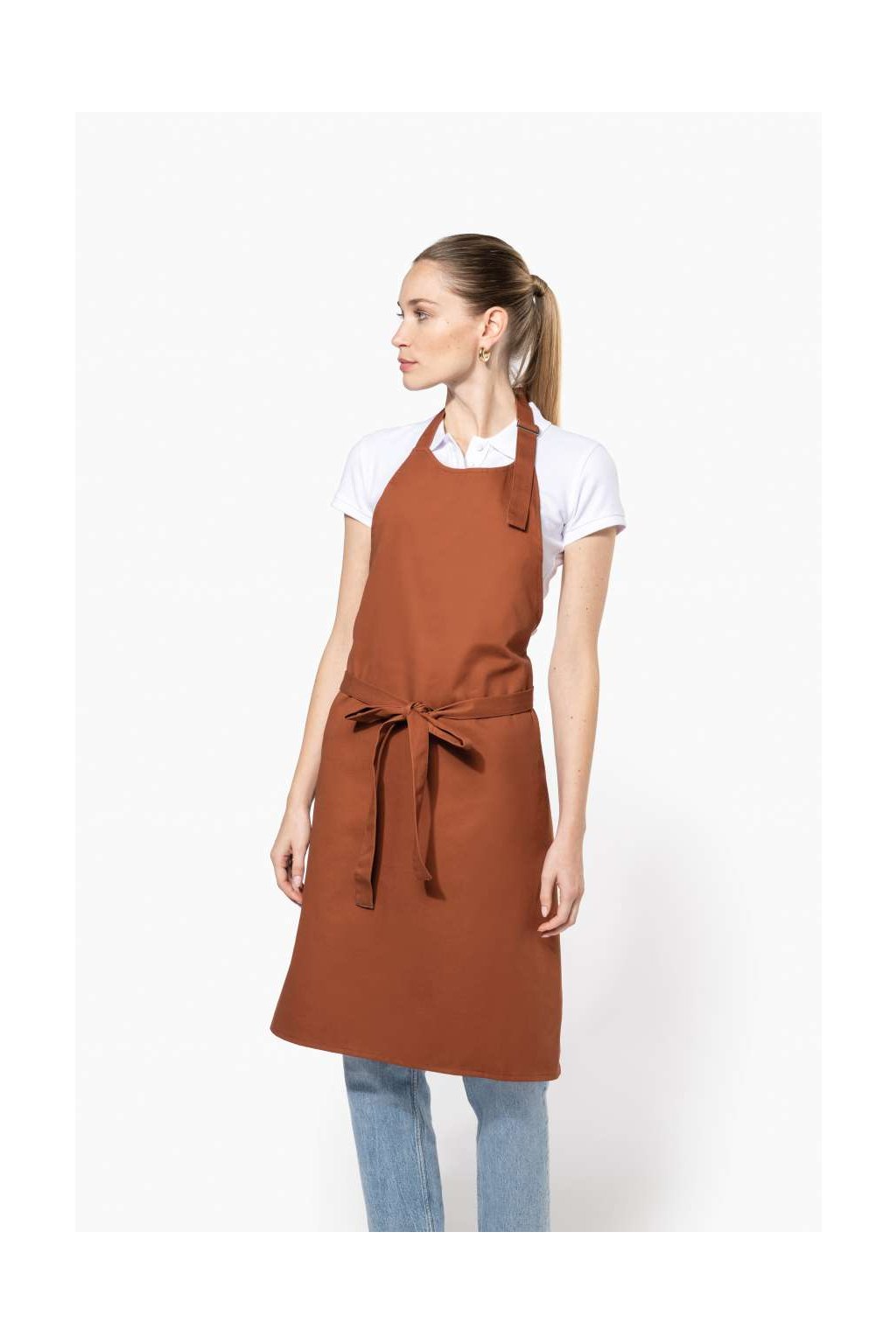 Univerzální bavlněná zástěra bez kapes. Délku lze nastavit pomocí posuvné kovové spony. Denimové barvy: specíální ošetření s úmyslem vypadat opotřebovaně. Prát lze na 60°C.