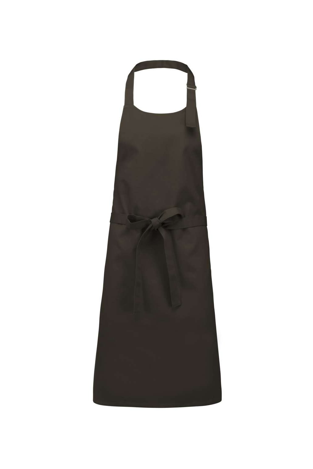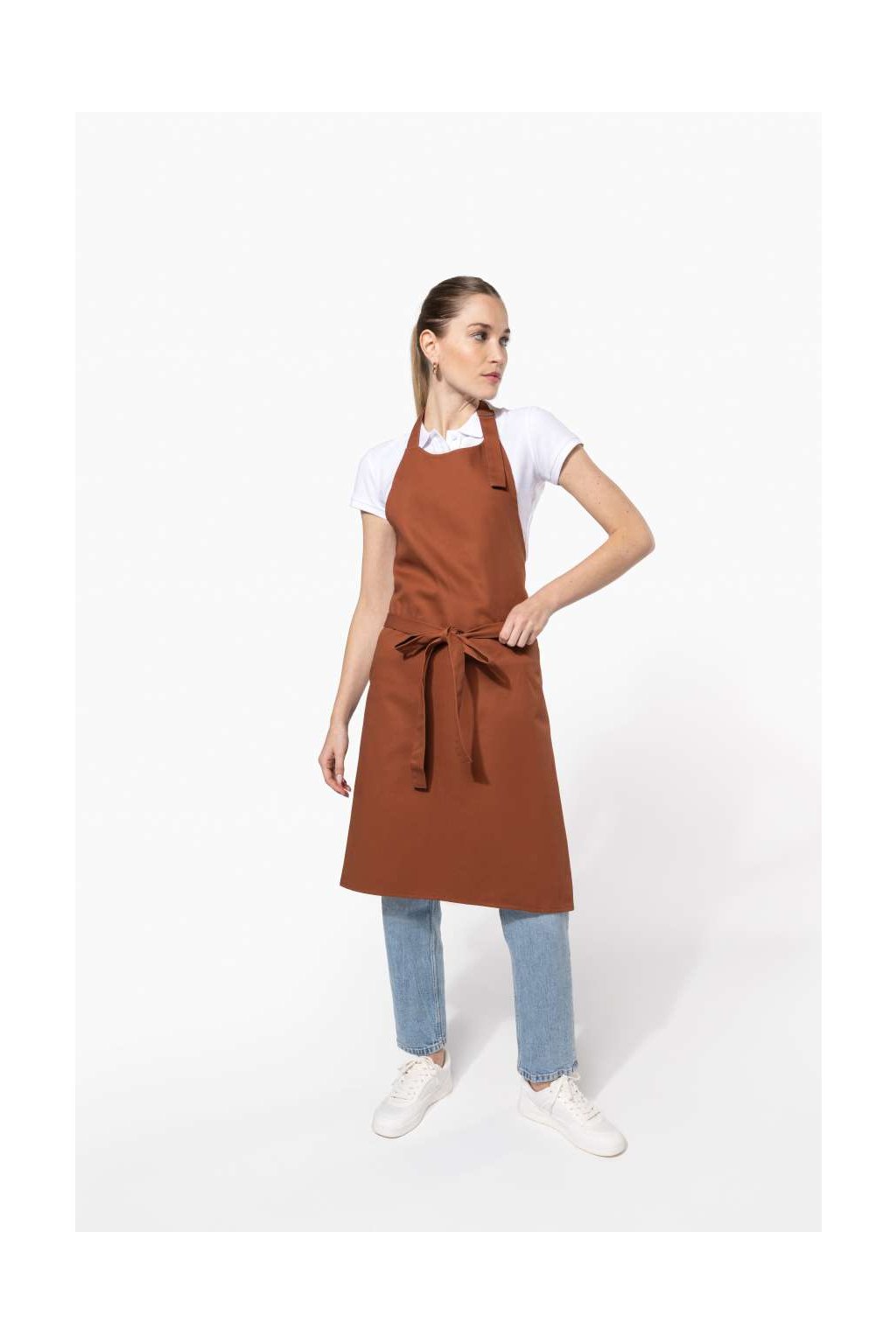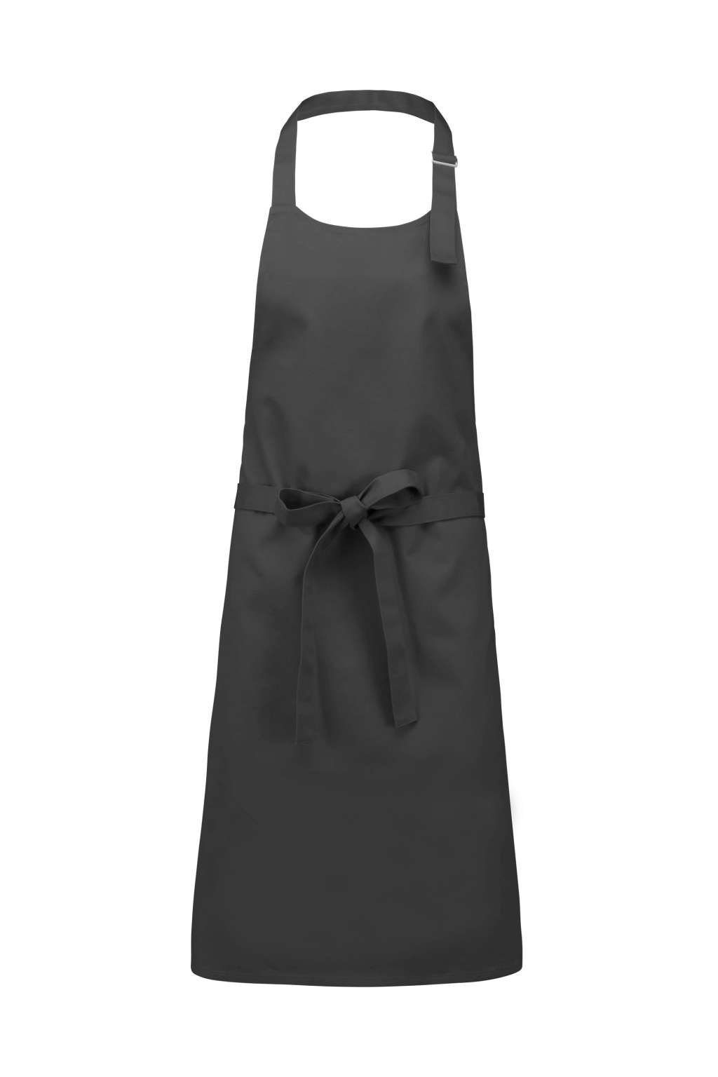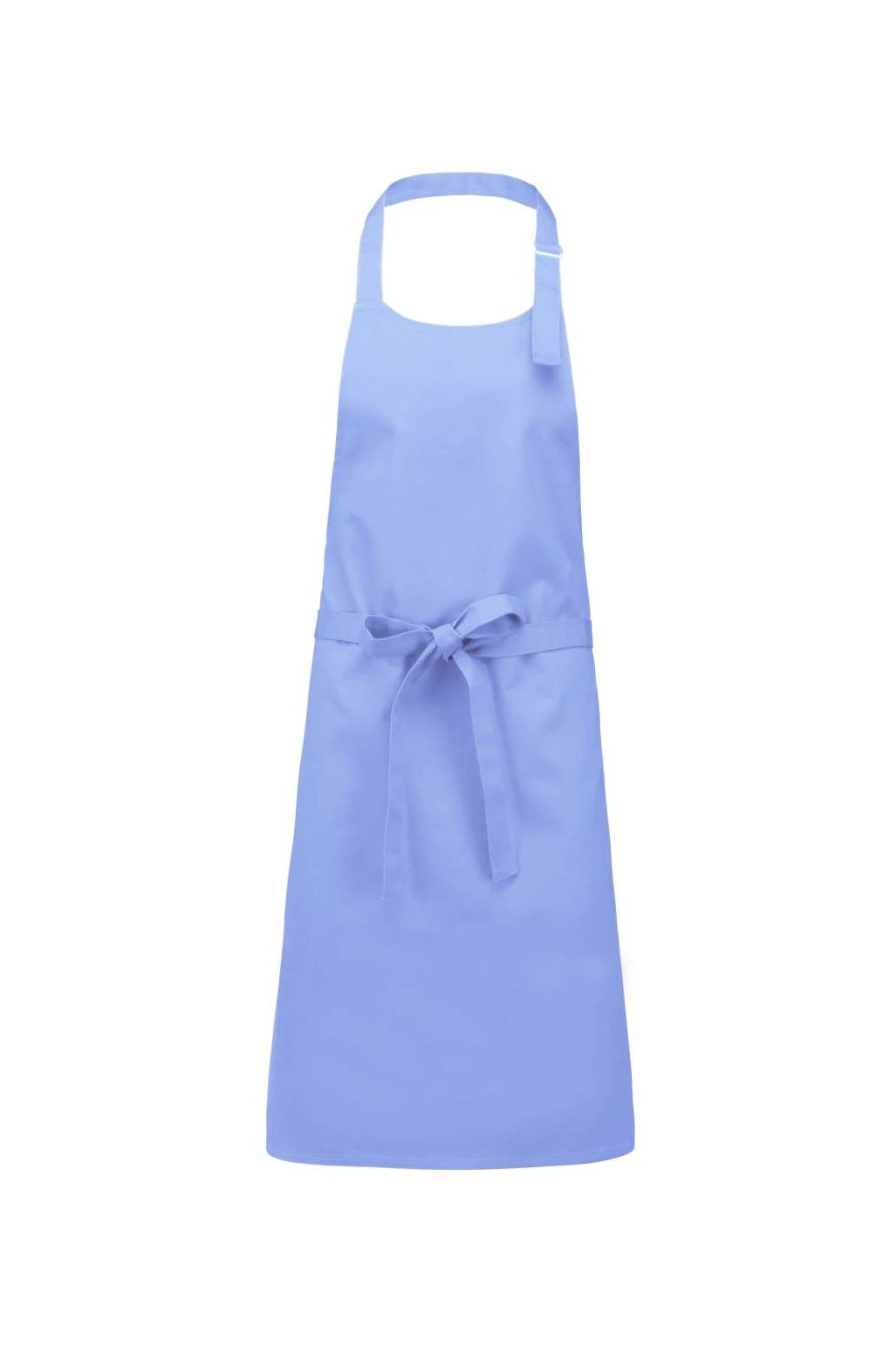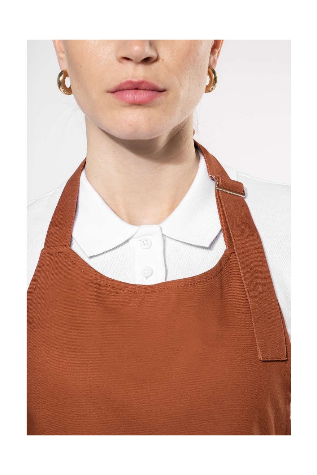 Univerzální bavlněná zástěra bez kapes. Délku lze nastavit pomocí posuvné kovové spony. Denimové barvy: specíální ošetření s úmyslem vypadat opotřebovaně. Prát lze na 60°C.